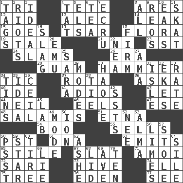 ACROSS 1. Three (prefix) 4. False hair 8. Ancient Greek god of war 12. Help 13. Actor Baldwin 14. Path through which fluid escapes 15. Leaves 17. Russian ruler of old 18. Plants 19. Showing deterioration from age 21. Corn or form start 23. Fast jet (abbr.) 24. Hits or strikes with great force 26. Epoch 28. Island territory of the United States 30. More given to overacting 34. Nervous spasm 37. Round or rotation of duties 39. "____ silly question..." 40. Binary compound 41. Goodbye (Sp.) 43. Allow 44. Famous astronaut Armstrong 46. Snakelike fish 47. Compass dir. 48. Deli grouping 51. Inactive volcano in Sicily 54. Surprise greeting 55. Makes a sale 58. Pacific Standard Time (abbr.) 61. Heredity factor (abbr.) 63. Sends forth 65. Vertical member of a panel or frame 67. Narrow board 71. Mine, in Marseilles 72. Indian skirt 73. Hub of activity 74. Pipe bend 75. Relationship diagram 76. Locale of original sin 77. Observe DOWN 1. Labels 2. Debaucheries 3. Standard of perfection 4. Make lace 5. Raised railways 6. Afternoon social gathering 7. Shade of tan 8. 100% 9. Vintage cars 10. Hearing organs 11. Three-handed card game 16. Volcanic refuse 18. Unshakable 20. Australian flightless bird 22. Teachers' org. 25. "Two Mules for Sister ____" 27. Housemaid (var.) 29. Methods 30. White Person, in Hawaii 31. Capri or Wight 32. Makes supply last 33. Pace 34. Airtight sealed metal containers 35. The content of cognition 36. To provide with a ceiling 38. Make a knot 42. Fast planes 45. Experiment locale 49. Method 50. Electrically charged atom 52. Born 53. _ mater 56. Citrus fruits 57. Fur scarf 58. Inconspicuous attention getter 59. Play the lead 60. Hoop that covers a wheel 62. American tennis player Robert 64. Drop; flow; fall 66. Falsehood 68. Flaplike covering 69. "___ Maria" 70. "___ Little Indians"