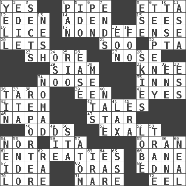 ACROSS 1. Affirmative reply 4. Corncob 8. Singer James 12. Paradise 14. An important port of Yemen 15. Perceives with the eye 16. Louse (plural) 17. Unrelated to defense, as in spending 20. Allows 21. "Barney Miller" actor Jack 22. Parent Teacher Association (abbr.) 23. Dinah or Pauly 27. Olfactory organ 29. Thailand, formerly 31. Leg joint 34. Trap for birds or small mammals 35. Taverns 36. Edible starchy tuberous root 39. Car or cant ending 41. Sight organs 42. A distinct part 43. Lies 46. California wine valley 47. Play the lead 48. Probability 51. Honor 54. And not 56. Call ___ day 58. NW Algerian seaport 61. Pleas 66. Object of repulsion 67. The main thing one is thinking about 68. Mouths or openings 69. Pulitzer Prize-winning author Ferber 70. Old wives' tales, e.g. 71. Female horse 72. Snakelike fish DOWN 1. Shout 2. Singer Brickell 3. Religious groups 4. Baking dish 5. Wedding promise 6. Animal enclosure 7. Conclusions 8. Compass dir. 9. 3-inch nail 10. Trial 11. Toward the sea 13. Delicate 18. Period of immesurable duration 19. Egg _ yung 24. Bear (Spanish) 25. _ de Janeiro 26. Relaxation 28. Atmospheres 30. Confronts 32. Compass dir. 33. Curvy letter 34. Roamer 36. Shallow baking pan 37. "One Day ___ Time" 38. Newsperson 40. Nathan's nickname 44. Not strict 45. Period 49. Pass on 50. R.R. building 52. Ear part 53. Buy and sell 54. Famous astronaut Armstrong 55. Southwest Nigerian state 57. Tiny particle 59. Singer Murray 60. Actress Patricia 62. Actress Charlotte 63. Retirement account (abbr.) 64. Ewer handle 65. Compass dir.