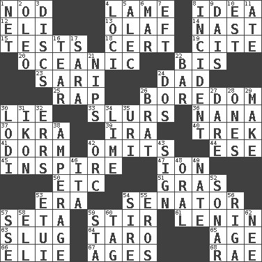 ACROSS 1. Lower and raise head in agreement 4. Unable to walk 8. The main thing one is thinking about 12. Connecticut Ivy Leaguer 13. Norwegian king 14. Political cartoonist Thomas 15. Trials 18. An absolute certainty 19. Quote 20. Pertaining to the sea 22. Twice 23. Indian skirt 24. June honoree 25. Strike 26. Mood resulting from idleness 30. Whopper 33. Runs notes together 36. Grandmother 37. Gumbo ingredient 39. Retirement account (abbr.) 40. Long journey 41. Dormintory (informal) 42. Leaves out 44. Compass dir. 45. Heighten or intensify 47. Electrically charged atom 50. And so on (abbr.) 51. Pate de foie ____ 53. Epoch 54. Elected representative 57. Bristle 59. Disorderly outburst 61. Soviet premier 1918-24 63. A hard, heavy blow 64. Pacific island yam 65. Ripen 66. Writer Wiesel 67. Grows older 68. Actress Charlotte DOWN 1. Fish or hair follower 2. Margarine 3. Plates 4. Venues 5. Actor Baldwin 6. Third mo. 7. Lizard (obsolete) 8. Happening 9. Raised platform 10. Eastern Standard Time (abbr.) 11. Had dinner 16. Pull apart 17. "Two Mules for Sister ____" 21. Pinches, bites 22. Soap unit 24. Two (Sp.) 26. Naughty child 27. Have the gumption 28. Singles 29. Create 30. Farming town in central California 31. Visual representation of an object 32. Blunders 34. Welles in "The Third Man" 35. RI univ. 38. Electrical Measurement 42. The grampus (Milton) 43. Attach a signature 46. Call ___ day 48. Taken by mouth 49. Nathan's nickname 52. Echolocation 53. Needle case 54. Title for a man of rank and authority 55. Greek god of love 56. Port city in Latvia 57. Compass dir. 58. Pipe bend 59. R.R. building 60. Label 62. Born