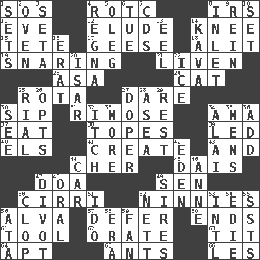 ACROSS 1. Mayday 4. College mil. group 8. Big collection agency 11. First lady 12. Evade 14. Leg joint 15. Wig 17. Honkers 18. Came down and settled, as after flight 19. Catching in a trap 21. Make or become more lively 23. White ___ sheet 24. Domesticated feline 25. Roll call or roster of names 27. Have the gumption 30. Small drink 31. Full of chinks, cracks, or crevices 34. Nanny (var.) 37. Consume 38. Drinks excessively 39. Directed 40. Raised railways 41. Make 43. Plus 44. "Mermaids" star 45. Raised platform 47. ___ good deed 49. Elected rep. 50. High-altitude cloud 52. Fools 56. Inventor's middle name 57. Put off 60. Extremities 61. Utensil 62. Declaim 63. Teat (slang) 64. Fitting 65. Pismires 66. French article DOWN 1. Puts into a specified state 2. Baking chamber 3. Stalk of a moss capsule 4. Canadian anthropologist Darnell 5. Cassini of fashion 6. Third day of the wk. 7. Music discs 8. An arm off of a larger body of water 9. It's straight from the horse's mouth 10. Arrange properly for use 13. Snakelike fish 14. Polynesian shrub of the pepper family 16. Part of Q.E.F. 20. Austrian river, tributary to the Danube 22. Frozen water 25. Monetary unit of Yemen 26. Elects 27. Drug addict 28. At sea 29. Remainder 30. Perceive with the eye 32. Hankering 33. Greater amount 34. Mountain range southwest of Kyrgyzstan 35. Not women's 36. Say or write further 42. Locale of original sin 44. 4-wheeled motor vehicle 46. Singer Murray 47. A piece of turf (Scot.) 48. Relating to the mouth 49. Male parents of animals 50. Hoof sound 51. Wedding promise 52. Remaining after all deductions 53. International (abbr.) 54. Singer Brickell 55. Fast planes 56. "One Day ___ Time" 58. Period 59. Air blower