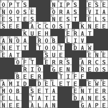 ACROSS 1. Elects 5. Pinches, bites 9. Compass dir. 12. Trap for birds or small mammals 14. Mouths or openings 15. By way of 16. _____ Park, CO 17. A home for chicks 18. Raised railways 19. Observe 20. Buttonhole 23. Leg joint 24. Malaysian steamed pastry 25. Part of Q.E.F. 27. Small Philippine buffalo 30. Director Reiner 32. 54 in ancient Rome 33. Remaining after all deductions 34. A blast of a horn 36. Simpleton 38. Erode 39. Take to court 40. Compass dir. 43. Often (poetically) 46. Blunders 48. Curves 49. River (Sp.) 51. Commissioned mil. rank 52. Vintage cars 53. Fermented drink made from hops 54. Small quarrel 56. Among 58. Keyboard key 61. She-sheep 64. Crowd into 65. Bristle 66. Keyboard key 68. Pipe bend 69. Jacques of French films 70. Natives or inhabitants of Denmark 71. Born 72. Actor Alda or Thicke 73. Yawn DOWN 1. Washington bills 2. Introduce or present, as a question 3. Haul 4. Compass dir. 5. Words to Nanette 6. Angers 7. Soft color 8. Fast jet (abbr.) 9. Incident 10. Filth; sediment 11. Comfort 13. He sold his birthright 21. Foregone conclusion 22. Elect 23. Polynesian shrub of the pepper family 24. Krazy ___ of comics 26. To free from 27. One (Scot) 28. Teachers' org. 29. "Beetle Bailey" pooch 31. Town 35. Cylindrical with tapered ends 37. Past tense of be (plural) 41. Non-commissioned officer (abbr.) 42. Double-curved letter 44. Flintstone 45. Standoff 47. In a ____ (agitated or irritated) 48. Sandy's bark 50. Severe or trying experience 53. Instruction Manual for Humans 55. Nourish 56. So be it 57. Undercover agent 59. Singer James 60. (Had) reclined 61. Inactive volcano in Sicily 62. Shed a tear 63. Celtic language 65. R.R. building 67. Tired old horse
