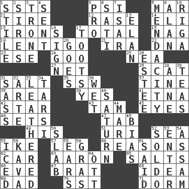 ACROSS 1. Fast planes 5. 23rd letter of the Greek alphabet 8. Make imperfect 11. Become fatigued 12. To erase 14. Connecticut Ivy Leaguer 15. Removes the wrinkles 17. Add up to 18. Tired old horse 19. Small, flat, pigmented spot on the skin 21. Lyricist Gershwin 22. Heredity factor (abbr.) 23. Compass dir. 24. Thick or sticky substance 25. Teachers' org. 27. Fish or hair follower 28. Scram, to a cat 31. Table seasoning 35. Compass dir. 37. Prong on a fork 38. Type of rug 39. Affirmative reply 41. Inactive volcano in Sicily 42. Play the lead 43. Scottish cap 45. Snake ____ (dice throw) 46. Arranges properly for use 47. Bar bill 49. Part of HMS, perhaps 51. RI univ. 52. Ocean 55. Eisenhower's nickname 57. Part of a journey 60. Thinks logically 62. 4-wheeled motor vehicle 63. Composer Copland 65. Table seasonings 66. Night before a holiday 67. Naughty child 68. It may be bright or harebrained 69. June honoree 70. Fast jet (abbr.) 71. Dormintory (informal) DOWN 1. Vertical member of a panel or frame 2. Male parents of animals 3. Marketplace scale 4. Transmitted 5. Adept person 6. Suttee (variant) 7. Austrian river, tributary to the Danube 8. Ananias' fault 9. Actor Alda or Thicke 10. Port city in Latvia 13. Style 16. Public display of a written message 17. A girl or young woman (variant) 20. Moves 26. First name in cosmetics 29. Queen of England 1702-14 30. Beverages made from leaves 31. Backtalk 32. Johnson of "Laugh-In" 33. Tough but pliablecoriaceous 34. Tarsus (plural) 36. Dripping 40. Titan orbits this 44. Female horse 48. Prejudice 50. Broad, flat, thick piece 52. Twentieth part of a lira 53. Keyboard key 54. Indian state 55. On the rocks 56. Polynesian shrub of the pepper family 58. Hearing organs 59. Pate de foie ____ 61. Stated 64. Baseball player Mel