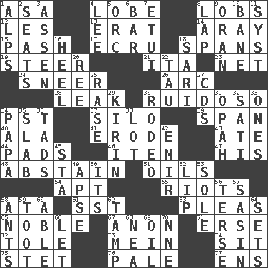 ACROSS 1. White ___ sheet 4. Ear part 8. Tennis shots 12. French article 13. Part of Q.E.F. 14. Like ___ of sunshine 15. Romantic infatuation 17. Shade of tan 18. Connects, as a bridge 19. Guide 21. Call ___ day 23. Fish or hair follower 24. Scornful expression 26. Curve 28. Path through which fluid escapes 30. Boisterous (Brazilian Portuguese) 34. Pacific Standard Time (abbr.) 37. Grain storage tower 39. Connect, as a bridge 40. Chicken ___ king 41. Eat (away) 43. Had dinner 44. Groovy apts. 46. A distinct part 47. Part of HMS, perhaps 48. Choose not to consume 51. Petroleums 54. Fitting 55. Debaucheries 58. _ moment's notice (2 wds.) 61. Fast jet (abbr.) 63. Entreaties 65. Having high moral qualities 67. At once, immediately (arch.) 71. Celtic language 72. Lacquered or enameled metalware 73. Chow _ 74. Be seated 75. Proofreading order 76. Light colored 77. Followers of ems DOWN 1. High mountains 2. Theater features 3. NE Netherlands city 4. Area sheltered from the wind 5. The grampus (Milton) 6. Long, evenly shaped piece 7. Needle holder 8. Pet locale 9. NW Algerian seaport 10. Object of repulsion 11. System (abbr.) 16. Person who is morally reprehensible 18. Indian skirt 20. Portuguese money of account (variant) 22. The 19th letter of the Greek alphabet 25. Raze (variant) 27. Music discs 29. Japanese brewing company 30. Cowboy competition 31. Brightly colored fish 32. Suttee (variant) 33. Washington bills 34. Dad 35. Broad, flat, thick piece 36. Small boys 38. Car dealer's back yard 42. Arab leader 45. R.R. building 49. Domed church section 50. It is 52. Mouth edge 53. Not divided or shared with others 56. Laconic 57. Indian antelope 58. Pismires 59. A blast of a horn 60. Competent 62. Pack (down) 64. Puts into a specified state 66. Allow 68. Teachers' org. 69. Petroleum 70. Compass dir.