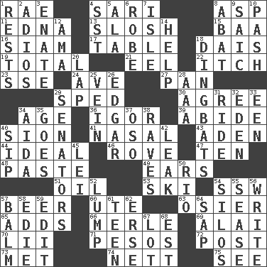 ACROSS 1. Actress Charlotte 4. Indian skirt 8. Viper 11. Pulitzer Prize-winning author Ferber 13. Splash clumsily 15. Sound made by sheep 16. Thailand, formerly 17. Eating place 18. Raised platform 19. "_____ Recall" 21. Snakelike fish 22. Hankering 23. Compass dir. 24. "___ Maria" 27. Baking dish 29. Moved rapidly 30. Match 34. Mature 36. Composer Stravinsky 39. Tolerate 40. The Jewish people; Israel 41. Rhinal 43. Arabian gulf 44. Perfect 46. Be footloose 47. Nine, plus one 48. Thick mixture 49. Hearing organs 51. Petroleum 53. What Jean-Claude Killy likes to do 54. Compass dir. 57. Fermented drink made from hops 60. Shoshoni 63. Flexible twig of a willow tree 65. Sums up 66. Haggard of country music 69. Mountain range southwest of Kyrgyzstan 70. Cards in a Roman deck? 71. Mexican monetary units 72. Mail 73. Was introduced to 74. Remaining after all deductions 75. Perceive with the eye DOWN 1. Musical pauses 2. Goodbye (Sp.) 3. Maternal 4. Fast jet (abbr.) 5. In the manner of 6. Loose flowing garment 7. Capri or Wight 8. Blind as ____ 9. Ketch in the Levant 10. Romantic infatuation 12. Wet nurse (var.) 14. Assist 18. Empty-headed or silly people 20. Infant locale 25. Distinctive style or manner 26. _ Allan Poe 28. American Automobile Association (abbr.) 29. Legislators 31. Travel on an animal 32. Paradise 33. Car or cant ending 34. Opera by Verdi 35. Moves 37. Bear (Spanish) 38. All-night dance parties 40. Small drink 42. Path through which fluid escapes 45. Luau accessory 50. _ de Janeiro 52. Mass 54. Grain storage towers 55. Gospel singer Marvin 56. Compose 57. Lip ointment 58. Singer Brickell 59. Prepare for publication 61. Adolescent 62. Celtic language 64. Plant excrement 67. Car dealer's back yard 68. Eastern Standard Time (abbr.)