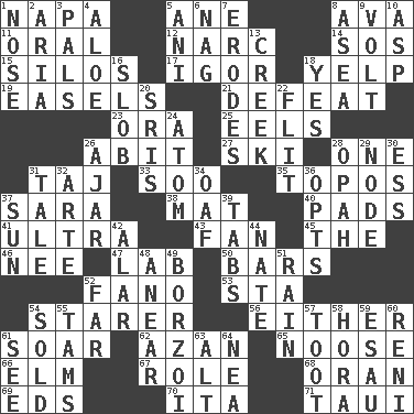 ACROSS 1. California wine valley 5. A saturated hydrocarbon 8. Actress Gardner 11. Spoken 12. Drug cop 14. Distress signal 15. Grain storage towers 17. Russian composer Stravinsky 18. Sharp bark 19. Artist's stands 21. Outscore 23. Mouth or opening 25. Snakelike fish 26. "This won't hurt ____!" 27. What Jean-Claude Killy likes to do 28. Single 31. _ Mahal 33. "Barney Miller" actor Jack 35. Literary convention 37. "Two Mules for Sister ____" 38. Floor protector 40. Groovy apts. 41. Extremist 43. Avid follower 45. Definite Article 46. Born 47. Experiment locale 50. Drinking establishments 52. Papal veil 53. R.R. building 54. A viewer who gazes fixedly 56. One or the other 61. Fly high 62. Muslim summons to prayer 65. Trap for birds or small mammals 66. Shade tree 67. Hero or heavy, e.g. 68. Northwest Algerian city 69. Begley and Asner 70. Call ___ day 71. "Change" in Tahitian DOWN 1. Characteristic smell of wine 2. Operatic vocal solo 3. Friends 4. _ vera 5. Cuckoo 6. Tired old horse 7. Eats (away) 8. At sea 9. Electrical Unit 10. Cleo's killer 13. Small stream 16. Oscar Madison type 18. It is so 20. Indian titles of respect 22. Secret move to avoid paying debts 24. Smallest unit of an element 26. Partly open 28. Brightly colored fish 29. Connecting point 30. Curvy letter 31. Story 32. Johnson of "Laugh-In" 34. Clumsy lout 36. Elects 37. Player for Phoenix 39. Bar bills 42. Having or resembling wings 44. Nathan's nickname 48. Approach 49. Tall fast-moving dog breed 51. Precipitation 52. At a great distance 54. Disposed of to a purchaser 55. Scottish caps 57. A blast of a horn 58. Israeli folk dance 59. Son of Isaac 60. Painter Guido (1575-1642) 61. Perceive with the eye 63. The first octave above the treble staff 64. Teachers' org.