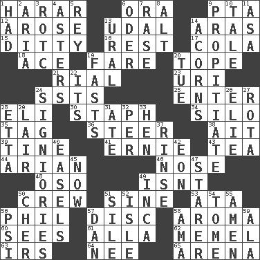 ACROSS 1. Ethiopian city, capital of Harari 6. Mouth or opening 9. Parent Teacher Assoc. 12. Came up 13. Freehold land 14. Caspian sea tributary 15. Short, simple song 16. Repose 17. Root beer relative 18. Adept person 19. Conductor's collection 20. Drink excessively 21. Monetary unit of Yemen 23. RI univ. 24. Fast planes 25. Keyboard key 28. Biblical high priest 30. Staphylococcus 34. Grain storage tower 35. Label 36. Navigate 38. Small island 39. Prong on a fork 41. Bert's buddy 43. Beverage made from leaves 44. Believer in; advocate of (suffix) 46. Sense of smell 48. Bear (Spanish) 49. Is not 50. Group working together 51. Trig term 53. "One Day ___ Time" 56. Silvers or Donahue 57. Compact _ 58. Scent 60. Perceives with the eye 61. Silent film actress Nazimova 62. Klaipeda city 63. Big collection agency 64. Born 65. Sports stadium DOWN 1. Possessed 2. Operatic vocal solo 3. College mil. group 4. Michaelmas daisies 5. Marina Del _, California 6. River in Europe 7. Raze (variant) 8. The first octave above the treble staff 9. Conciliate 10. Falsehood 11. White ___ sheet 13. Mountain range 14. Oak nuts 19. Goes without food and/or water 20. Third day of the wk. 22. ___ a Wonderful Life 24. Seigniories (variant) 26. Writer Wiesel 27. Round or rotation of duties 28. Singer James 29. Den 31. Had dinner 32. For each 33. Layer 37. Wash lightly 40. Artist's stands 42. Period of immesurable duration 45. Immediately 47. A viewer who gazes fixedly 49. South American Indian 50. "Mermaids" star 51. Filth; sediment 52. Capri or Wight 54. Heavy book 55. So be it 56. 23rd letter of the Greek alphabet 57. Daniel's nick name 58. Nanny (var.) 59. Chicken ___ king