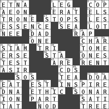 ACROSS 1. Inactive volcano in Sicily 5. Part of a journey 8. Police officer (slang) 11. Period of immesurable duration 12. Part of Q.E.F. 14. Raised railways 15. Heavy duty weighing machine 17. Ceases 18. French article 19. Gist 21. Ocean 22. Car dealer's back yard 23. Born 24. Male parent 25. Reproach for some lapse or misdeed 27. Single 28. Burn to charcoal 31. Thailand, formerly 35. Three (prefix) 37. Heavy book 38. Celtic language 39. R.R. building 41. Washington bills 42. Trial 43. "We ___ not amused" (Victoria) 45. Monthly bill 46. SW Saudi Arabia district 47. Music discs 49. Distress signal 51. Beverage made from leaves 52. ___ good deed 55. Ingest 57. Eastern Standard Time (abbr.) 60. Motivate 62. Heredity factor (abbr.) 63. Value system 65. Underwater navigation system 66. Electrically charged atom 67. Role in a play 68. Suttee (variant) 69. Make lace 70. Allow head to fall sleepily 71. Relationship diagram DOWN 1. Consumed 2. Laconic 3. Trap for birds or small mammals 4. Queen of England 1702-14 5. Allow 6. Greek god of love 7. Yawn 8. Portable communications device 9. Butter sub 10. Inconspicuous attention getter 13. Russian ruler of old 16. Inside; within (prefix) 17. Spring feasts 20. Patter 26. Thespian 29. So be it 30. State of inaction 31. Stalk of a moss capsule 32. Angers 33. Aide 34. Paris' subway 36. Call ___ day 40. Northern region 44. Paradise 48. Backtalk 50. Ooze 52. Middle Eastern gold or silver currency 53. Speak pompously 54. Nest on high 55. Prepare for publication 56. Small Philippine buffalo 58. Comedian Laurel of Laurel & Hardy 59. Through, poetically 61. Mail 64. It would