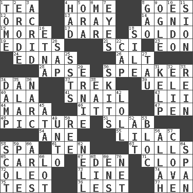 ACROSS 1. Afternoon social gathering 4. Dwelling 8. Moves 12. The grampus (Milton) 13. Like ___ of sunshine 14. Hindu god of fire 15. Greater amount 17. Have the gumption 18. Twentieth part of a lira 19. Proofreads 21. _-fi 23. Period of immesurable duration 24. Ferber et al. 26. Keyboard modifier key 28. Domed church section 30. Orator 34. One of the 12 tribes of Israel 37. Long journey 39. Ubangi River tributary 40. Wing 41. Slow-paced one 43. Cards in a Roman deck? 44. Hindu Mythology: god of death 46. "Tell ____ the Marines!" 47. Writing instrument 48. Photo 51. Thick slice 54. A saturated hydrocarbon 55. Pale purple color 58. Health resort 61. "___ Little Indians" 63. For Whom the Bell _____ 65. Monte _, Las Vegas Hotel/Casino 67. Locale of original sin 71. Hoof sound 72. Butter sub 73. Actor's bit 74. Actress Gardner 75. Trial 76. For fear that 77. Layer DOWN 1. Heavy book 2. Eat (away) 3. Sour-tasting 4. Possessed 5. Mouth or opening 6. Make imperfect 7. Sight organs 8. E Mali city 9. Stare at amorously 10. Inside; within (prefix) 11. The Jewish people; Israel 16. Inactive volcano in Sicily 18. Drop; flow; fall 20. Plant excrement 22. Head covering 25. Fast planes 27. The 19th letter of the Greek alphabet 29. Bert's buddy 30. Burlesque acts 31. Seaweed 32. Writer Wiesel 33. It's straight from the horse's mouth 34. Moist 35. Jai ____ 36. Drug cop 38. Erode 42. Hang loosely or laxly 45. _ moment's notice (2 wds.) 49. To (old English) 50. Portuguese money of account (variant) 52. Small island 53. Group of countries in special alliance 56. Assad's deity 57. Garlic unit 58. Highlander 59. Light colored 60. Ancient Greek god of war 62. 1994 drama film starring Jodie Foster 64. Connect, as a bridge 66. Car dealer's back yard 68. Expire 69. Followers of ems 70. Fish or hair follower