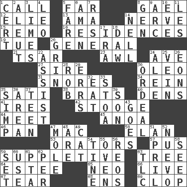 ACROSS 1. Give a ring to 5. At a great distance 8. Highlander 12. Writer Wiesel 13. Nanny (var.) 14. Impudent aggressiveness 15. San ____ (Riviera town) 16. Dwellings 19. Third day of the wk. 20. Commissioned military rank 21. Russian ruler of old 23. Leather borer 24. "___ Maria" 27. Title for a man of rank and authority 30. Margarine 31. Sounds asleep 34. It's straight from the horse's mouth 35. Suttee (variant) 38. Naughty children 40. Habitations of wild animals 41. Angers 42. Moe Howard, for one 44. Confront 45. Small Philippine buffalo 46. Baking dish 47. Apple computer (short form) 50. Style 53. Speakers 57. Tenth month of the Hindu calendar 59. Supplying deficiencies 63. Family _ (genealogy) 64. First name in cosmetics 65. Modern: prefix 66. Not recorded 67. Separate forcefully 68. Followers of ems 69. Hoof sound DOWN 1. An absolute certainty 2. Native American of Southwest Alaska 3. Citrus fruits 4. Lion 5. Conductor's collection 6. So be it 7. Raze (variant) 8. Commissioned mil. rank 9. Curve 10. Night before a holiday 11. French article 14. 1994 drama film starring Jodie Foster 17. Retirement account (abbr.) 18. Simpleton 20. Amused look 22. Help 24. Toward shelter 25. Distinctive style or manner 26. Immeasurably long periods of time 28. Director Reiner 29. Blunders 30. Severe or trying experience 32. Consume 33. Portico 35. Simple or foolish person 36. Length times width 37. Adolescent 39. Manchild 43. Travels 47. Undercover agent 48. "We ___ not amused" (Victoria) 49. Feline 51. Showery time 52. New (sp.) 54. Prong on a fork 55. Baking chamber 56. Vintage cars 58. Ooze 59. Put into a specified state 60. Purpose 61. Parent Teacher Association (abbr.) 62. For each 63. Affectionate concern, for short