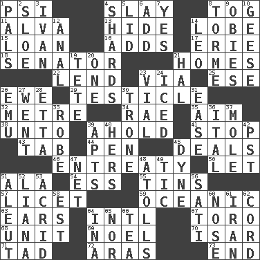 ACROSS 1. Air pressure measure (abbr.) 4. Kill 8. Coat; cloak 11. Inventor's middle name 13. Flintstone garb 14. Ear part 15. Grant temporary use of 16. Does sums 17. One of the Great Lakes 18. Elected representative 21. Dwellings 22. Grant temporary use of 23. By way of 25. Compass dir. 26. She-sheep 29. A testis 32. Distance measurement (Brit.) 34. Actress Charlotte 35. Direct toward a target or goal 38. To (old English) 39. Hold, grip (Informal) 41. Halt 43. Bar bill 44. Writing instrument 45. Allots cards 46. Plea 50. Allow 51. According to 54. Curvy letter 55. Metal containers 57. It is permitted: Lat. 59. Pertaining to the sea 63. Hearing organs 64. International (abbr.) 67. "Corrida" creature 68. A single undivided whole 69. Christmas carol 70. Austrian river, tributary to the Danube 71. Small boy 72. Caspian sea tributary 73. Conclude DOWN 1. Friends 2. _ gin 3. _ the terrible 4. Broken pieces 5. Flaplike covering 6. Find the sum of 7. It is so 8. Singer Mel 9. Off-Broadway awards 10. Honkers 12. Of or related to the anus 14. Lion 19. False hair 20. Single 21. Actor Linden 23. Small bottle 24. On the rocks 26. Australian flightless bird 27. Left 28. Singer James 30. Marketplace scale 31. Relaxation 33. Loose flowing garment 36. Slanted text style (abbr.) 37. Undercover agent 39. Flats, for short 40. Possessive pronoun 42. Pacific Standard Time (abbr.) 45. Unit of force 47. Fish or hair follower 48. Ringlike coral islands and reefs 49. Nervous spasm 51. Eskimo relative 52. Woody, climbing, usually tropical plant 53. Sour-tasting 56. Suttee (variant) 58. Eastern Standard Time (abbr.) 60. Sense of smell 61. SW Asia republic 62. Drawstring 64. _ tizzy (2 wds.) 65. And not 66. Afternoon social gathering