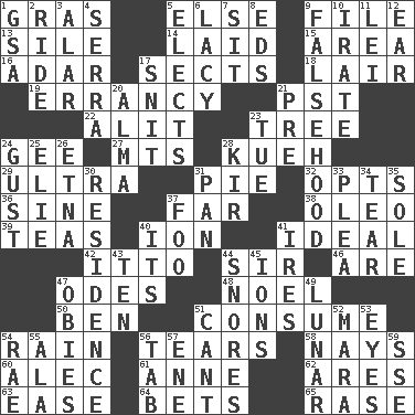 ACROSS 1. Pate de foie ____ 5. Otherwise 9. Do some clerical work 13. Filth; sediment 14. Put down 15. Type of rug 16. The sixth month of the Jewish calendar 17. Religious groups 18. Den 19. Tendancy to err 21. Pacific Standard Time (abbr.) 22. Came down and settled, as after flight 23. Family _ (genealogy) 24. Turn to the right 27. Mountains (abbr.) 28. Malaysian steamed pastry 29. Extremist 31. Sliced dessert 32. Chooses 36. Trig term 37. Distant 38. Margarine 39. Afternoon social gatherings 40. Electrically charged atom 41. Perfect 42. "Tell ____ the Marines!" 44. Title for a knight 46. "We ___ not amused" (Victoria) 47. Lyric poems 48. Christmas carol 50. Benjamin's nick name 51. Ingest 54. Water falling in drops from the sky 56. Pulls into pieces 58. Negative votes 60. Actor Baldwin 61. Singer Murray 62. Ancient Greek god of war 63. Relaxation 64. Wagers 65. To erase DOWN 1. Girls' org. (abbr.) 2. Travel on or in a vehicle 3. Having or resembling wings 4. Spanish missionary in California 5. Opts 6. Made of lace 7. Be seated 8. Begley and Asner 9. It jiggles the polygraph 10. Feeling or showing extreme anger 11. Luau accessory 12. Hearing organ 17. In a ____ (agitated or irritated) 20. _ mater 21. Before (prefix) 23. Third day of the wk. 24. Abrupt rush of wind 25. Writer Wiesel 26. Inactive volcano in Sicily 28. Apertif with cassis 30. Dwelling 31. Baking dish 33. Entreaty 34. Separate forcefully 35. Not divided or shared with others 37. Egg _ yung 40. ___ a Wonderful Life 41. Angers 43. Nine, plus one 44. Sounds asleep 45. Charged atoms 47. Off-Broadway awards 49. Type of eclipse 51. Patter 52. Hindu Mythology: god of death 53. Sight organs 54. Actress Charlotte 55. Insect wing 56. Keyboard key 57. Compass dir. 59. Compass dir.