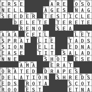 ACROSS 1. Celtic language 5. "We ___ not amused" (Victoria) 8. Bear (Spanish) 11. 1994 drama film starring Jodie Foster 12. Eras 13. Tired old horse 14. Sowing specialist 17. A testis 19. Erase 21. Cylindrical with tapered ends 22. Western Nevada city 23. Ocean 24. American Automobile Association (abbr.) 27. To provide with a ceiling 29. Allow 32. Small fatty European fish 34. Whopper 36. Small amounts or degrees 37. The Jewish people; Israel 38. Biblical high priest 39. Pulitzer Prize-winning author Ferber 40. Comfort 41. Teat (slang) 42. First course 43. Compass dir. 44. Opportunity 46. Compass dir. 47. Nursemaid (var.) 50. Part of Q.E.F. 52. Declaimed 55. Window treatments 57. Conveyance 59. Fragments 62. Begley and Asner 63. Round or rotation of duties 64. Native of Scotland 65. Friend of Pooh 66. Eastern Standard Time (abbr.) 67. Inactive volcano in Sicily DOWN 1. Followers of ems 2. To riddle 3. Downhill vehicle 4. A person who is older than you are 5. Ripen 6. Musical pauses 7. First name in cosmetics 8. Single time 9. Table seasoning 10. Double curve, resembling the letter S 12. Had dinner 15. Choose 16. French philosopher Descartes 18. Lyricist Gershwin 20. Bathroom 24. NE Netherlands city 25. Bee-related 26. Came up 28. Ms. Damita and namesakes 29. Dipping utensil 30. Ferber et al. 31. Sadhe (variant) 33. A saturated hydrocarbon 35. One or the other 36. Afternoon social gathering 42. Staphylococcus 45. Mouths or openings 47. _ moment's notice (2 wds.) 48. Distance measurement (Brit.) 49. Goodbye (Sp.) 51. Laconic 52. Baltic tributary 53. Make new 54. In addition 55. Heredity factor (abbr.) 56. Religious group 58. Baseball player Mel 60. Spanish title 61. R.R. building