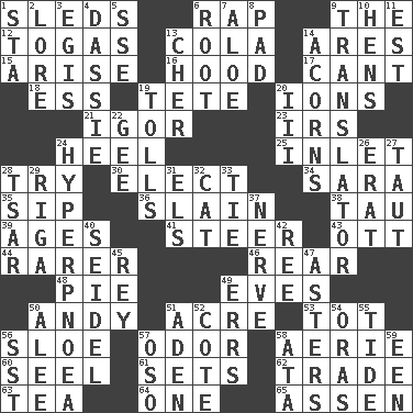 ACROSS 1. Bobsleighs 6. Strike 9. Definite Article 12. Ancient Roman robes 13. Root beer relative 14. Ancient Greek god of war 15. Ascend 16. Parka part 17. Patter 18. Curvy letter 19. False hair 20. Charged atoms 21. Russian composer Stravinsky 23. Big collection agency 24. Person who is morally reprehensible 25. An arm off of a larger body of water 28. Attempt to accomplish something 30. Opt 34. "Two Mules for Sister ____" 35. Small drink 36. Killed 38. The 19th letter of the Greek alphabet 39. Matures 41. Navigate 43. Baseball player Mel 44. More valued for its uncommonness 46. Hitchcock's "____ Window" 48. Sliced dessert 49. Nights before holidays 50. "60 Minutes" Commentator Rooney 51. 43,560 square feet 53. Small child 56. A type of plum 57. Aroma 58. Nest on high 60. Stitch closed the eyes of (a falcon) 61. Puts into a specified state 62. Barter 63. Beverage made from leaves 64. Single 65. NE Netherlands city DOWN 1. R.R. building 2. Old wives' tales, e.g. 3. Armor plate that protects the chest 4. Hyrax 5. Compass dir. 6. Carrot, for example 7. _ vera 8. Groovy apt. 9. Interpreter 10. Coop moms 11. Eastern Standard Time (abbr.) 13. "Mermaids" star 14. Oak nuts 19. For Whom the Bell _____ 20. One more than two 22. Turn to the right 24. Abnormally rapid or deep breathing 26. Part of Q.E.F. 27. Tense 28. Russian ruler of old 29. Capital of Latvia 31. Raised railways 32. Domesticated feline 33. Standoff 37. Boldness 40. A glass for beer 42. To riddle 45. Marina Del _, California 47. Michaelmas daisies 49. Blunders 50. Toward shelter 51. Arabian gulf 52. ____ d'Azur (French Riviera) 54. Mouths or openings 55. Event that recurs at intervals 56. Fast jet (abbr.) 57. Bear (Spanish) 58. _ moment's notice (2 wds.) 59. Car or cant ending