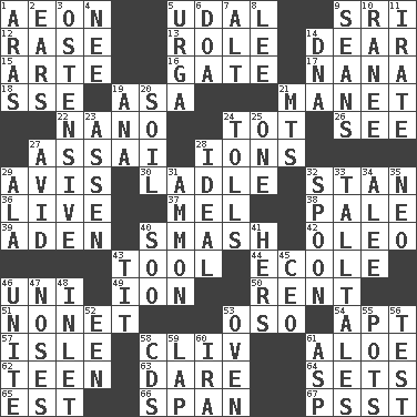 ACROSS 1. Age 5. Freehold land 9. _ Lanka 12. To erase 13. Hero or heavy, e.g. 14. Letter starter 15. Johnson of "Laugh-In" 16. Yard entry 17. Grandmother 18. Compass dir. 19. White ___ sheet 21. French painter Edouard 22. Billionth: prefix 24. Small child 26. Perceive with the eye 27. Slender Brazilian palm 28. Charged particles 29. Opinion 30. Dipping utensil 32. Comedian Laurel of Laurel & Hardy 36. Not recorded 37. Cartoonist voice _ Blanc 38. Light colored 39. Arabian gulf 40. Box-office sellout 42. Butter sub 43. Utensil 44. Learning spot: Fr. 46. Corn or form start 49. Electrically charged atom 50. Monthly bill 51. Music written for nine 53. Bear (Spanish) 54. Fitting 57. Capri or Wight 58. 154 in Roman numerals 61. Medicinal plant 62. Adolescent 63. Have the gumption 64. Puts into a specified state 65. Eastern Standard Time (abbr.) 66. Connect, as a bridge 67. Inconspicuous attention getter DOWN 1. Caspian sea tributary 2. Hearing organs 3. Clearly or manifestly demonstrative 4. Born 5. Capital and largest city of Mongolia 6. ___ good deed 7. Keyboard modifier key 8. Area sheltered from the wind 9. Actors Connery and Penn 10. Indian princess (variant) 11. Feeling or showing extreme anger 14. Heredity factor (abbr.) 19. Santa ___, CA 20. Land 21. Mountains (abbr.) 23. NE Netherlands city 24. For Whom the Bell _____ 25. Single 27. Enthusiastic 28. Standard of perfection 29. In the manner of 31. ID or VA city 32. Soup utensil 33. Baron Munchausen's specialties 34. Toward shelter 35. Modern: prefix 40. "Barney Miller" actor Jack 41. Possessive pronoun 43. Teat (slang) 45. Corporate head (abbr.) 46. Join together 47. Olfactory organs 48. An arm off of a larger body of water 52. Car or cant ending 53. Baking chamber 55. Cooking vessels 56. Trial 58. Music discs 59. Pet locale 60. Retirement account (abbr.) 61. Cleo's killer