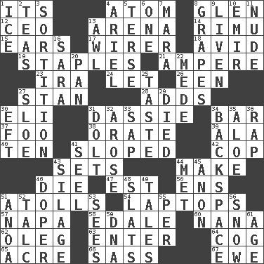 ACROSS 1. ___ a Wonderful Life 4. Smallest unit of an element 8. Small, secluded valley 12. Corporate head (abbr.) 13. Sports stadium 14. Tall New Zealand timber tree 15. Hearing organs 17. One who wires 18. Enthusiastic 19. Paper fasteners 21. Electrical Unit 23. Lyricist Gershwin 24. Allow 26. Car or cant ending 27. Comedian Laurel of Laurel & Hardy 28. Does sums 30. Biblical high priest 31. Small ungulate mammals of Africa 34. Long, evenly shaped piece 37. Egg _ yung 38. Speak pompously 39. Chicken ___ king 40. Nine, plus one 41. Had an oblique or slanted direction 42. Police officer (slang) 43. Puts into a specified state 44. Cause to be 46. Pass on 47. Eastern Standard Time (abbr.) 50. Followers of ems 51. Ringlike coral islands and reefs 54. Portable computers 57. California wine valley 58. Peak District village in England 60. Nanny 62. Cassini of fashion 63. Keyboard key 64. Gear tooth 65. Measure of real estate 66. Backtalk 67. She-sheep DOWN 1. Frozen water 2. Afternoon social gatherings 3. Drawing lots 4. Satellite of Uranus 5. Laconic 6. Single 7. Hindu Mythology: god of death 8. Wine fruits 9. Make or become more lively 10. Arab leader 11. Naked 13. Leather borer 16. "Two Mules for Sister ____" 20. Baking dish 22. Ancient Persian 25. Clothes sense 27. A type of plum 29. Passed on 30. Newt 31. Stupid person 32. Came up 33. Plant excrement 34. Keyboard key 35. Medicinal plant 36. Strike 41. Stitch closed the eyes of (a falcon) 43. Fodder prepared in a silo 44. Was introduced to 45. Soon (poet.) 46. Drug addict 48. Narrow boards 49. Stories 51. Small Philippine buffalo 52. Baby powder 53. Perceives with the eye 55. For each 56. Overwhelm 59. Heredity factor (abbr.) 61. Mature