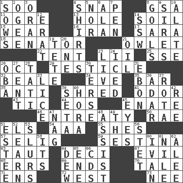 ACROSS 1. "Barney Miller" actor Jack 4. Fastener 8. Girls' org. (abbr.) 11. Legendary monster 13. Hollow 14. Earth 15. Put on (as clothing) 16. SW Asia republic 17. "Two Mules for Sister ____" 18. Legislator 21. A small or young owl 22. Portable shelter 23. Cards in a Roman deck? 25. Compass dir. 26. Sep. follower 29. A testis 32. Memphis, Tenn. Street 34. First lady 35. Tavern 38. Opposed to 39. Fragment 41. Aroma 43. Nervous spasm 44. Greek goddess of the dawn 45. Maternal 46. Plea 50. Actress Charlotte 51. Raised railways 54. American Automobile Association (abbr.) 55. "______ My Girl" (Turtles hit) 57. Major League Baseball Commissioner Bud 59. French poetic form 63. Drawn tight 64. Tenth: prefix 67. Morally bad or wrong 68. Blunders 69. Extremities 70. Falsehood 71. Followers of ems 72. Compass direction 73. Born DOWN 1. Sty mamas 2. Double curve, resembling the letter S 3. Northwest Algerian city 4. Upper-body garments 5. And not 6. According to 7. Fenced enclosure 8. Scores awarded for successful feats 9. Male parents of animals 10. Having winglike extensions 12. Part of Q.E.F. 14. Compass dir. 19. False hair 20. Single 21. Lubricate 23. Not recorded 24. On the rocks 26. Chief or king in Benin or Nigeria 27. Penny 28. Jacques of French films 30. Laconic 31. Inky black, to poets 33. Louse (plural) 36. The sixth month of the Jewish calendar 37. Roll call or roster of names 39. Stalk of a moss capsule 40. Israeli folk dance 42. To sift 45. Sight organs 47. Tired old horse 48. Aid 49. Definite Article 51. First name in cosmetics 52. Acquire or gain knowledge or skills 53. Disparaging remarks 56. Proofreading order 58. ___ a Wonderful Life 60. _ the terrible 61. Mediterranean tributary 62. Toward shelter 64. Morning condensation 65. Compass dir. 66. Music discs