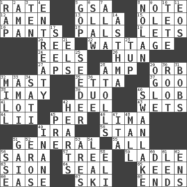 ACROSS 1. Pace 5. Girls' org. (abbr.) 8. Musical sound 12. So be it 13. Water jar 15. Butter sub 16. Leg coverings 18. Friends 19. Allows 20. To sift 22. Electrical Measurement 24. Snakelike fish 26. Attila the _ 27. Domed church section 28. Electrical Unit 29. Globe 32. Vertical spar for supporting sails 35. Singer James 37. Thick or sticky substance 38. "If ____ say so..." 39. Superhero pair 40. Oscar Madison type 41. Car dealer's back yard 42. Person who is morally reprehensible 43. Moistens 44. Cards in a Roman deck? 45. For each 46. Pale green bean 49. Retirement account (abbr.) 50. Comedian Laurel of Laurel & Hardy 51. Commissioned military rank 55. 100% 56. "Two Mules for Sister ____" 57. Woody plant 59. Dipping utensil 63. The Jewish people; Israel 64. Lick closed 65. Peachy ____! 66. Relaxation 67. What Jean-Claude Killy likes to do 68. Conclusions DOWN 1. Strike 2. Nursemaid (var.) 3. Nine, plus one 4. Plea 5. Republican Party 6. Cole _ (cabbage dish) 7. Silent film actress Nazimova 8. Pitcher Ryan 9. Cassini of fashion 10. Wig 11. Greek goddess of the dawn 14. Respiratory problem 17. Ooze 21. Raised railways 23. Uncastrated adult male sheep 25. Sowing specialist 28. Ringlike coral islands and reefs 29. Stare at amorously 30. Carrot, for example 31. Moves up and down 32. Place where flour is made 33. Mine, in Marseilles 34. Suttee (variant) 36. Third day of the wk. 40. Tchaikovsky ballet 42. Centers of feelings and intuitions 45. Before (prefix) 47. Call ___ day 48. Promenade 49. Silly 51. Greek goddess of the earth (variant) 52. Greek god of love 53. Ancient Greek god of war 54. Path through which fluid escapes 56. Compass dir. 58. Biblical high priest 60. Lair 61. Directed 62. Followers of ems
