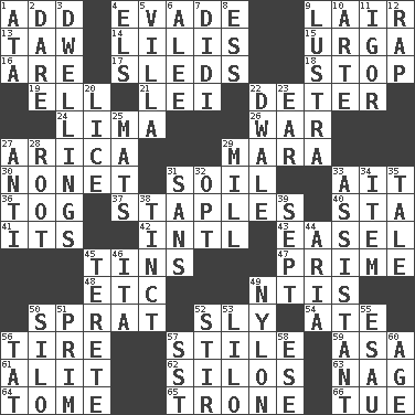 ACROSS 1. Find the sum of 4. Elude 9. Den 13. The 23rd letter of the Hebrew alphabet 14. Ms. Damita and namesakes 15. Capital and largest city of Mongolia 16. "We ___ not amused" (Victoria) 17. Bobsleighs 18. Constrict 19. Pipe bend 21. Luau accessory 22. Prevent from occurring 24. Pale green bean 26. Armed conflict 27. N. Chile seaport 29. Hindu Mythology: god of death 30. Music written for nine 31. The visible part of the earth's surface 33. Small island 36. Coat; cloak 37. Paper fasteners 40. R.R. building 41. ___ a Wonderful Life 42. International (abbr.) 43. Artist's stand 45. Metal containers 47. A-one 48. And so on (abbr.) 49. Nuclear Threat Initiatives 50. Small fatty European fish 52. Secret 54. Had dinner 56. Hoop that covers a wheel 57. Vertical member of a panel or frame 59. White ___ sheet 61. Came down and settled, as after flight 62. Grain storage towers 63. Tired old horse 64. Heavy book 65. Marketplace scale 66. Third day of the wk. DOWN 1. "One Day ___ Time" 2. Have the gumption 3. Residences 4. Raised railways 5. Country estate 6. Toward shelter 7. "You Light Up My Life" star Conn 8. Curvy letter 9. A period of five years 10. Johnson of "Laugh-In" 11. Composer Stravinsky 12. Strike 20. Louse (plural) 22. A sleeping potion; an opiate (poet.) 23. Ewer handle 25. Floor coverings 27. Opposed to 28. Carrot, for example 29. Place where flour is made 31. Without 32. Elect 33. Helper 34. A whole individual unit 35. Lie 38. Colored lightly or faintly 39. Back-to-school mo. 44. Operatic vocal solo 45. Cylindrical with tapered ends 46. Call ___ day 49. High-strength synthetic material 50. Grain storage tower 51. Demure 52. Use a swizzle stick 53. _ and Stitch 55. Son of Isaac 56. Make lace 57. Fast jet (abbr.) 58. Compass dir. 60. Personal question