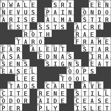 ACROSS 1. A sleeping potion; an opiate (poet.) 6. _ Lanka 9. Car or cant ending 12. Congenital growth or mark on the skin 13. Ache 14. Southwest Nigerian state 15. Get up 16. _ mater 17. Agitate 18. Eastern Standard Time (abbr.) 19. Fast planes 20. 1/640 square mile 21. Writer of Portnoy's Complaint (1969) 23. Actress Charlotte 24. Pacific island yam 25. Movie unit 28. Ewer handle 30. Native American of Southwest Alaska 34. Play the lead 35. White ___ sheet 36. Ferber et al. 38. Retirement account (abbr.) 39. Elected reps. 41. Signals 43. Ingest 44. Artist's stand 46. I made a mistake 48. Area sheltered from the wind 49. Utensil 50. Small amounts or degrees 51. Draw slowly or heavily 53. "___ Maria" 56. Quote 57. French philosopher Descartes 58. Free of sound 60. Scent 61. Assistant 62. Desist 63. For each 64. Strand of rope, yarn or thread 65. Small island DOWN 1. Heredity factor (abbr.) 2. Past tense of be (plural) 3. Advice 4. A period of five years 5. Compass dir. 6. Table seasoning 7. Basketball hoops 8. _ tizzy (2 wds.) 9. Pleas 10. Singer Brickell 11. Or not 13. Romantic infatuation 14. Motion picture awards 19. Took without asking 20. Sandy's bark 22. Mouth or opening 24. Interpreter 26. Hindu Mythology: god of death 27. Part of Q.E.F. 28. Comfort 29. At sea 31. Begley and Asner 32. Corn or form start 33. Label 37. Snob 40. Sowing specialist 42. "Barney Miller" actor Jack 45. French article 47. Food holders 49. Family _ (genealogy) 50. Event that recurs at intervals 51. To provide with a ceiling 52. Actor Griffith 54. Small bottle 55. Otherwise 56. Police officer (slang) 57. Strike 58. _-fi 59. Allow
