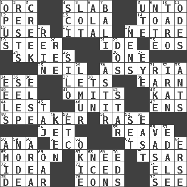 ACROSS 1. The grampus (Milton) 4. Thick slice 8. To (old English) 12. For each 13. Root beer relative 14. Frog relative 15. One who uses or employs something 17. Slanted text style (abbr.) 18. Distance measurement (Brit.) 19. Navigate 21. Binary compound 23. Greek goddess of the dawn 24. Atmospheres 26. Single 28. Famous astronaut Armstrong 30. Nineveh was its capital 34. Compass dir. 37. Allows 39. Merit 40. Snakelike fish 41. Leaves out 43. Krazy ___ of comics 44. For fear that 46. A single undivided whole 47. Followers of ems 48. Orator 51. To erase 54. Type of plane 55. Rob, plunder, or pillage 58. Santa ___, CA 61. Environmental prefix 63. Sadhe (variant) 65. Person of subnormal intelligence 67. Leg joint 71. Russian ruler of old 72. It may be bright or harebrained 73. On the rocks 74. Raised railways 75. Letter starter 76. Immeasurably long periods of time 77. Perceive with the eye DOWN 1. Musical composition 2. Musical pauses 3. Small stream 4. _-fi 5. Car dealer's back yard 6. Chicken ___ king 7. Indonesian resort city 8. Shoshoni 9. Musical sound 10. Pacific island yam 11. Lyric poems 16. It's straight from the horse's mouth 18. Not women's 20. To separate or throw off 22. Two (Sp.) 25. Grain storage tower 27. Sight organ 29. Arboreal primate 30. Moving about 31. Libertine 32. SW Asia republic 33. Pismires 34. Snakelike fish 35. Ooze 36. Otherwise 38. Metal container 42. Play the lead 45. _ Mahal 49. Peachy ____! 50. And so on (abbr.) 52. Put into a specified state 53. 90 degrees 56. Flower holders 57. Peak District village in England 58. Among 59. Connecting point 60. Type of rug 62. Migrant worker of the '30s 64. Celtic language 66. Rowing implement 68. Non-commissioned officer (abbr.) 69. Car or cant ending 70. Begley and Asner