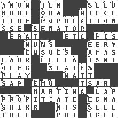 ACROSS 1. At once, immediately (arch.) 5. Nine, plus one 8. Downhill vehicle 12. Thickened enlargement 13. Chief or king in Benin or Nigeria 14. Sibling's daughter 15. Event that recurs at intervals 16. Census information 19. Compass dir. 20. Elected representative 21. Part of Q.E.F. 23. And so on (abbr.) 24. Part of HMS, perhaps 27. Religious women 30. Suggestive of the supernatural 31. Follows as a consequence or result 34. Dec. holiday 35. Cowardly lion portrayer 38. Man or boy (slang) 40. Is not 41. Cassini of fashion 42. Chalkboards 44. Frolic 45. Electrical Unit 46. Plant excrement 47. Australian flightless bird 50. Russian ruler of old 53. Chrissie's court nemesis 57. Infant locale 59. Appease 63. Pulitzer Prize-winning author Ferber 64. Bake eggs in their shells 65. Mountains (abbr.) 66. Stitch closed the eyes of (a falcon) 67. Lacquered or enameled metalware 68. Cooking vessel 69. Woody plant DOWN 1. Pismires 2. Annoying sound 3. More peculiar 4. Born 5. Drink excessively 6. Inky black, to poets 7. California wine valley 8. Be seated 9. Luau accessory 10. Environmental prefix 11. Lair 14. Drug cop 17. Shoshoni 18. Car dealer's back yard 20. Astound 22. Disorder of the immune system 24. Cloth borders 25. SW Asia republic 26. System (abbr.) 28. Overdraft (abbr.) 29. Takes to court 30. Has an existence 32. Pipe bend 33. Cole _ (cabbage dish) 35. Chops off 36. Silent film actress Nazimova 37. Pile 39. _ moment's notice (2 wds.) 43. Singer James 47. Independent ruler or chieftain 48. Floor protector 49. RI univ. 51. Tree or shrub in the Birch family 52. Indian princess (variant) 54. Pack (down) 55. "Tell ____ the Marines!" 56. A home for chicks 58. Light colored 59. Pacific Standard Time (abbr.) 60. 17th letter of the Greek alphabet 61. Lubricate 62. Before (prefix) 63. Eastern Standard Time (abbr.)
