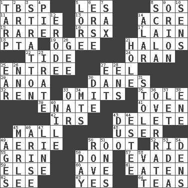 ACROSS 1. Cook's measure (abbr.) 5. French article 8. Distress signal 11. Nick name for Arthur 13. Mouth or opening 14. Land measure 15. More uncommon 16. Acura sports coupe 17. (Had) reclined 18. Parent Teacher Assoc. 19. Double curve, resembling the letter S 21. Auras 22. Periodic rise and fall of the sea level 24. NW Algerian seaport 25. Main course 27. Snakelike fish 29. Small Philippine buffalo 30. Natives or inhabitants of Denmark 32. Monthly bill 33. Leaves out 35. Lacquered or enameled metalware 39. Maternal 41. Baking chamber 42. Big collection agency 43. Keyboard key 45. Promenade 48. One who uses or employs something 49. Nest on high 50. Carrot, for example 52. To free from 55. Broad smile 56. Spanish title 57. Dodge 59. Otherwise 60. "___ Maria" 61. Ingested 62. Observe 63. It is so 64. Afternoon social gatherings DOWN 1. Canvas cover 2. Naughty child 3. Ski resort town in Vermont 4. Sliced dessert 5. Old wives' tales, e.g. 6. Celtic language 7. Saxophone 8. Any of the three canals of the cochlea 9. Greek mythologigal hunter 10. Elected reps. 12. Eat (away) 14. Having or resembling wings 20. Unit of force equal to gravity 21. Hollow 23. Feeling or showing extreme anger 25. Hearing organ 26. Compass dir. 27. Consume 28. Followers of ems 30. Expire 31. Took without asking 33. Boat paddle 34. Mountains (abbr.) 36. Make much ado about nothing 37. Allow 38. Compass dir. 40. Mediterranean tributary 43. Superhero pair 44. First name in cosmetics 45. Haggard of country music 46. Originate 47. Actor's bit 49. Matures 50. Be footloose 51. Washington bills 53. The content of cognition 54. Hiding places for outlaws 56. 24 hours 58. Large container
