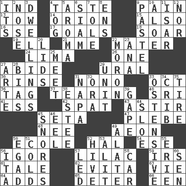 ACROSS 1. Indiana (abbr.) 4. Clothes sense 9. Ache 13. Pull behind 14. Greek mythologigal hunter 15. In addition 16. Compass dir. 17. Finish lines 18. Fly high 19. Pipe bend 21. Madame (abbr.) 22. Mother 24. Pale green bean 26. Single 27. Remain 29. Mountain range 30. Remove soap 31. Words to Nanette 33. Sep. follower 36. Label 37. Lacerating 40. Indian title of respect (Mr.) 41. Curvy letter 42. Argument over a trivial matter 43. Moving about 45. Bristle 47. Military trainee 48. Born 49. A really long time 50. Learning spot: Fr. 52. Actor Linden 54. Compass dir. 56. Russian composer Stravinsky 57. Pale purple color 59. Big collection agency 61. Falsehood 62. Webber/Rice musical 63. Compete 64. Does sums 65. Prevent from occurring 66. Car or cant ending DOWN 1. ___ a Wonderful Life 2. Olfactory organ 3. Homes 4. Coat; cloak 5. Scent 6. Thailand, formerly 7. Lacquered or enameled metalware 8. Followers of ems 9. Soft color 10. _ vera 11. Austrian river, tributary to the Danube 12. And not 20. Hats (slang) 22. Person of subnormal intelligence 23. Santa ___, CA 25. Rendezvous 27. Johnson of "Laugh-In" 28. Prejudice 29. A single undivided whole 31. California wine valley 32. Mouth or opening 33. Clearly or manifestly demonstrative 34. Baby bed with high sides 35. Become fatigued 38. First name in cosmetics 39. Stare wonderingly 44. A type of plum 45. Sounds asleep 46. Snakelike fish 49. Having winglike extensions 50. Mild oath 51. Having a low temperature 52. Hub of activity 53. Came down and settled, as after flight 55. One of the Great Lakes 56. Call ___ day 57. Directed 58. 4-wheeled motor vehicle 60. Elected rep.