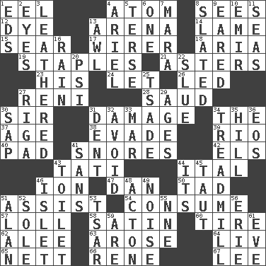 ACROSS 1. Snakelike fish 4. Tiny particle 8. Observes 12. Color 13. Sports stadium 14. Unable to walk 15. Singe 17. One who wires 18. Roberta Peters solo 19. Paper fasteners 21. Michaelmas daisies 23. Part of HMS, perhaps 24. Allow 26. Directed 27. Painter Guido (1575-1642) 28. Saudi Arabian king (1953-1964) 30. Title for a knight 31. Break 34. Definite Article 37. Mature 38. Elude 39. _ de Janeiro 40. Groovy apt. 41. Sounds asleep 42. Raised railways 43. Jacques of French films 44. Slanted text style (abbr.) 46. Electrically charged atom 47. Daniel's nick name 50. Bit 51. Aid 54. Ingest 57. Hang loosely or laxly 58. Smooth fabric 60. Hoop that covers a wheel 62. Toward shelter 63. Came up 64. 54 in ancient Rome 65. Remaining after all deductions 66. French philosopher Descartes 67. Area sheltered from the wind DOWN 1. Begley and Asner 2. Sight organs 3. Resembling or made to resemble leather 4. Satellite of Uranus 5. Laconic 6. Single 7. Hindu Mythology: god of death 8. Scheduled 9. Having ears or earlike features 10. Independent ruler or chieftain 11. Oceans 13. Leather borer 16. Water falling in drops from the sky 20. Air pressure measure (abbr.) 22. Change direction abruptly 25. Sadhe (variant) 27. Port city in Latvia 29. Matures 30. Plant excrement 31. Gouge 32. Prevent the occurrence of 33. Third mo. 34. Excercise machine 35. Land elevation 36. Greek goddess of the dawn 41. Without 43. Bathroom plumbing fixture 44. It is 45. Pulled tight 46. Small island 48. NE Massachussets city 49. Annoying sound 51. ____ Jay Lerner 52. Not divided or shared with others 53. Russian ruler of old 55. Compass dir. 56. 4th largest of the Great Lakes 59. "We ___ not amused" (Victoria) 61. Night before a holiday