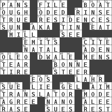ACROSS 1. Baking dishes 5. Do some clerical work 9. Water vessel 13. Ending for "Through" and "Enough" 14. Wrote a lyric poem 15. Wash lightly 16. Loyal 17. Homes 19. Player for Phoenix 20. Alias (abbr.) 21. Shallow baking pan 22. Consume 23. Place where flour is made 25. Perceive with the eye 26. Sends forth 30. Quote 34. Relating to or accompanying birth 35. Arabian gulf 36. Margarine 39. A sleeping potion; an opiate (poet.) 42. Not women's 43. Pull apart 44. Child's nurse 46. Become fatigued 47. Guide 48. Greek goddess of the dawn 51. Cowardly lion portrayer 54. Take to court 57. Untruth 58. Set 60. Direct toward a target or goal 62. Interpreter 65. Method 66. Match 67. Billionth: prefix 68. Toward shelter 69. Raze (variant) 70. Takes to court 71. State of inaction DOWN 1. Plant holders 2. Gold (Symbol: Au) 3. Group of southern Bantu languages 4. A female animal or person 5. Tined utensil 6. It may be bright or harebrained 7. French article 8. Proofreads 9. Storage container 10. Single time 11. At sea 12. Trial 15. French philosopher Descartes 18. Expire 20. _ mater 24. Poe poem 27. It would 28. The 23rd letter of the Hebrew alphabet 29. Broad, flat, thick pieces 30. Device for capturing images 31. Binary compound 32. "___ Little Indians" 33. Followers of ems 36. Baseball player Mel 37. Flowery wreath 38. Ewer handle 40. Car dealer's back yard 41. Compass dir. 45. 1994 drama film starring Jodie Foster 48. Otherwise 49. Petroleum 50. Seines 52. White Person, in Hawaii 53. Amusement-park features 54. Play the lead 55. Capital and largest city of Mongolia 56. Hearing organs 58. Went 59. Greek god of love 61. Confront 63. Born 64. The 19th letter of the Greek alphabet 65. Spoil