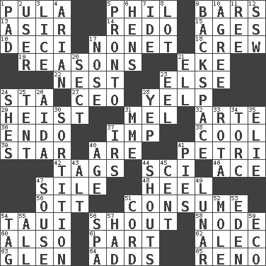 ACROSS 1. Monetary unit of Botswana 5. Silvers or Donahue 9. Soap units 13. SW Saudi Arabia district 14. Redecorate 15. Ripens 16. Tenth: prefix 17. Music written for nine 18. Ship's personnel 19. Thinks logically 21. Supplement with great effort 22. Egg locale 23. Otherwise 24. R.R. building 27. Corporate head (abbr.) 28. Sharp bark 29. Robbery 31. Cartoonist voice _ Blanc 32. Johnson of "Laugh-In" 36. Inside; within (prefix) 37. Naughty child 38. Calm and collected 39. Play the lead 40. "We ___ not amused" (Victoria) 41. _ dish (used to culture cells) 42. Labels 44. _-fi 46. Adept person 47. Filth; sediment 48. Person who is morally reprehensible 50. Baseball player Mel 51. Eat 54. "Change" in Tahitian 56. Yell 58. Thickened enlargement 60. In addition 61. Piece 62. Actor Baldwin 63. Small, secluded valley 64. Sums up 65. Former U.S. Attorney General Janet DOWN 1. Writing tablet 2. One who uses or employs something 3. Louse (plural) 4. Believer in; advocate of (suffix) 5. Right away 6. Coop moms 7. Binary compound 8. Car dealer's back yard 9. Keyboard key 10. Match 11. To sift 12. Compass dir. 17. Olfactory organ 20. Religious group 21. Pipe bend 23. Snakelike fish 24. "______ My Girl" (Turtles hit) 25. Portable shelter 26. Opera by Verdi 28. Slangy assent 30. Conclusion 31. Madame (abbr.) 33. Roll call or roster of names 34. Torque (variant) 35. Writer Wiesel 37. Big collection agency 40. Ripen 41. Sliced desserts 43. The first octave above the treble staff 44. Yells 45. Penny 47. Lush 49. Type of eclipse 51. Drawstring 52. Undercover agent 53. Locale of original sin 54. Label 55. 100% 56. Health resort 57. Possessed 59. Environmental prefix