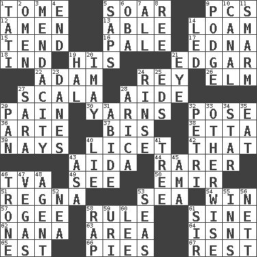 ACROSS 1. Heavy book 5. Fly high 9. Personal Computers (abbr.) 12. So be it 13. Competent 14. Rich soil 15. Be inclined (to) 16. Diluted with white 17. Pulitzer Prize-winning author Ferber 18. Working for oneself (abbr.) 19. Part of HMS, perhaps 21. _ Allan Poe 22. First of billions? 24. Marina Del _, California 26. Shade tree 27. Any of the three canals of the cochlea 28. Helper 29. Ache 30. Entertaining tales 32. Introduce or present, as a question 36. Johnson of "Laugh-In" 37. Twice 38. Singer James 39. Negative votes 40. It is permitted: Lat. 42. Not this but _ 43. Opera by Verdi 44. More uncommon 46. Federal power corp. 49. Perceive with the eye 50. Arab leader 51. Rain (Swedish) 53. Ocean 54. Acquire through effort 57. Double curve, resembling the letter S 58. Governing power 61. Trig term 62. Nanny 63. Type of rug 64. Is not 65. Eastern Standard Time (abbr.) 66. Sliced desserts 67. Remainder DOWN 1. Jacques of French films 2. Sign of things to come 3. Ananias' fault 4. Conclusion 5. Plant excrements 6. Chief or king in Benin or Nigeria 7. 100% 8. To riddle 9. Puddle 10. Lessep's creation 11. Excessive but superficial compliments 14. Directed 19. Actor Linden 20. "If ____ say so..." 21. Sight organ 23. Natives or inhabitants of Denmark 24. Wash lightly 25. Begley and Asner 27. "Two Mules for Sister ____" 28. N. Chile seaport 29. Baking dish 31. Tolerate 32. _ dish (used to culture cells) 33. Else 34. Play the lead 35. Ingest 40. Falsehood 41. Woody plant 43. White ___ sheet 45. Nanny (var.) 46. Marketplace scale 47. Viva Las _ 48. Rep 52. Teachers' org. 53. Oceans 55. Restaurants 56. Remaining after all deductions 58. Hit sharply and swiftly 59. RI univ. 60. Area sheltered from the wind 61. Title for a knight