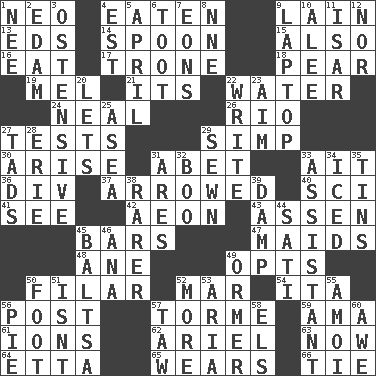 ACROSS 1. Modern: prefix 4. Ingested 9. (Had) reclined 13. Begley and Asner 14. Soup utensil 15. In addition 16. Erode 17. Marketplace scale 18. Lightbulb-shaped fruit 19. Cartoonist voice _ Blanc 21. ___ a Wonderful Life 22. Wetness 24. Anneal 26. _ de Janeiro 27. Trials 29. Simple or foolish person 30. Ascend 31. Collude with 33. Small island 36. HTML Container Element 37. Moved like an arrow 40. _-fi 41. Observe 42. Age 43. NE Netherlands city 45. Taverns 47. Women servants 48. One (Scot) 49. Elects 50. Having threads 52. Third mo. 54. Call ___ day 56. Mail 57. Singer Mel 59. Nursemaid (var.) 61. Charged particles 62. Satellite of Uranus 63. At this time 64. Singer James 65. Erodes 66. Make a knot DOWN 1. Born 2. Dutch treat 3. Clearly or manifestly demonstrative 4. Eastern Standard Time (abbr.) 5. Showery time 6. A blast of a horn 7. Immeasurably long periods of time 8. Compass dir. 9. Portable computer 10. Toward shelter 11. Austrian river, tributary to the Danube 12. And not 20. Allows 22. Compose 23. Direct toward a target or goal 25. Toward the sea 27. Small boys 28. 4th largest of the Great Lakes 29. Stitched 31. Ancient Greek god of war 32. Surprise greeting 33. Aide 34. On the rocks 35. Metal containers 38. Less widely known 39. Moist 44. Suttee (variant) 45. Greek mezzo-soprano Agnes 46. Santa ___, CA 49. Abalone 50. Pick up the tab 51. Is not 52. Greater amount 53. Operatic vocal solo 55. Mine, in Marseilles 56. Sliced dessert 57. The 23rd letter of the Hebrew alphabet 58. Raised railways 60. Deep reverence