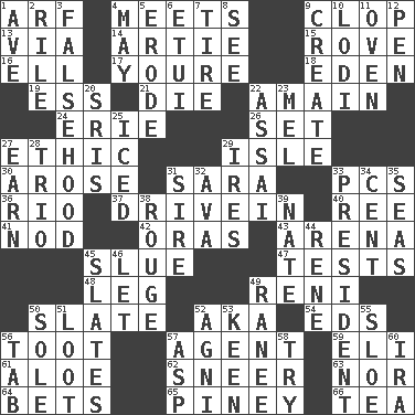 ACROSS 1. Sandy's bark 4. Confronts 9. Hoof sound 13. By way of 14. Nick name for Arthur 15. Be footloose 16. Pipe bend 17. You are 18. Genesis locale 19. Curvy letter 21. Pass on 22. With great haste 24. One of the Great Lakes 26. Put into a specified state 27. Moral principle 29. Capri or Wight 30. Came up 31. "Two Mules for Sister ____" 33. Personal Computers (abbr.) 36. _ de Janeiro 37. Popular '50s hangout 40. To separate or throw off 41. Allow head to fall sleepily 42. Mouths or openings 43. Sports stadium 45. Change direction abruptly 47. Trials 48. Part of a journey 49. Painter Guido (1575-1642) 50. Schedule 52. Alias (abbr.) 54. Begley and Asner 56. A blast of a horn 57. Representative 59. Biblical high priest 61. _ vera 62. Scornful expression 63. And not 64. Wagers 65. Abounding in pines 66. Beverage made from leaves DOWN 1. "___ Maria" 2. Cause heat under the collar 3. It jiggles the polygraph 4. Can I? 5. Eat (away) 6. Needle holder 7. Hoop that covers a wheel 8. Observe 9. Cause to be 10. Farming town in central California 11. Baking chamber 12. Animal enclosure 20. Indian titles of respect 22. Slender Brazilian palm 23. Cartoonist voice _ Blanc 25. On the rocks 27. Merit 28. Musical group of three 29. Angers 31. The founder of a family 32. Actress Gardner 33. Elected leader of a country 34. Penny 35. Oceans 38. Makeup applied to the cheeks 39. Nathan's nickname 44. French philosopher Descartes 45. Chalkboards 46. Allow 49. The wife of a rajah (variant) 50. Not divided or shared with others 51. Plunder 52. Hindu god of fire 53. Peachy ____! 55. _ gin 56. Bar bill 57. Cleo's killer 58. Attempt to accomplish something 60. Lyricist Gershwin