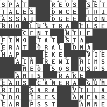 ACROSS 1. Argument over a trivial matter 5. Vintage cars 9. Arrange properly for use 12. Lies 14. Single time 15. Three (prefix) 16. Slender Brazilian palm 17. Double curve, resembling the letter S 18. Electrically charged atom 19. 17th letter of the Greek alphabet 20. A period of five years 23. Otherwise 24. Penny 25. "Death on the ____" 27. A pale, very dry sherry 30. Make lace 32. R.R. building 33. Part of Q.E.F. 34. Spoken 36. Heredity factor (abbr.) 38. Atlas unit 39. Make supply last 40. Compete 43. The 18th letter of the Arabic alphabet 46. Painter Guido (1575-1642) 48. Basketball hoops 49. Modern: prefix 51. Mayday 52. United States Postal Service (abbr.) 53. Pismires 54. Immoral or dissolute person 56. Hearing organs 58. Device for capturing images 61. Chewing product 64. To free from 65. "Two Mules for Sister ____" 66. Country residence 68. Wedding promise 69. Angers 70. Approach 71. Ewer handle 72. Inconspicuous attention getter 73. Queen of England 1702-14 DOWN 1. Play the lead 2. Romantic infatuation 3. In addition 4. Beverage made from leaves 5. Carrot, for example 6. Engineer (abbr.) 7. Seas 8. Observe 9. Vertical member of a panel or frame 10. Greek god of love 11. Prong on a fork 13. Drop; flow; fall 21. To (old English) 22. A viewer who gazes fixedly 23. Liveliness 24. Small bed 26. It would 27. Opposite of masc. 28. Lyricist Gershwin 29. California wine valley 31. Receives possession of 35. Poe poem 37. Deliberation 41. Mischievous child 42. Double-curved letter 44. Restaurants 45. Fish or hair follower 47. Austrian river, tributary to the Danube 48. Regret 50. Motion picture awards 53. Zeal 55. Polynesian shrub of the pepper family 56. 4th largest of the Great Lakes 57. Opera by Verdi 59. Ancient Greek god of war 60. Vertical spar for supporting sails 61. Small, secluded valley 62. ____ Bator 63. Female horse 65. Small drink 67. _ tizzy (2 wds.)