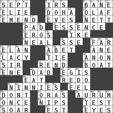 ACROSS 1. Back-to-school mo. 5. Big collection agency 8. Object of repulsion 12. Writer Wiesel 13. Capital of the state of Qatar 15. Norwegian king 16. Make improvements or corrections to 18. Nights before holidays 19. Remaining after all deductions 20. Writing tablet 22. Gist 24. Greek god of love 26. D.D.E's nickname 27. Be tempered by heat 28. Compass dir. 29. Distant 32. Liveliness 35. Collude with 37. One (Scot) 38. Made of lace 39. Standoff 40. At once, immediately (arch.) 41. Title for a knight 42. Tear apart 43. Water vessel 44. Compass dir. 45. June honoree 46. The front part of a cuirass 49. Ingest 50. Do over again 51. Fools 55. Snakelike fish 56. Do not 57. Mouths or openings 59. Gold (Symbol: Au) 63. At one time in the past 64. Cuts off 65. Trial 66. Fly high 67. Eastern Standard Time (abbr.) 68. Snake ____ (dice throw) DOWN 1. Observe 2. Shade tree 3. Sliced dessert 4. 3-inch nail 5. Binary compound 6. Be footloose 7. "______ My Girl" (Turtles hit) 8. Child's nurse 9. Actor Baldwin 10. Nathan's nickname 11. Bank Draft (abbr.) 14. Aid 17. Have the gumption 21. ___ good deed 23. Make supply last 25. Scheduled 28. Sowing specialist 29. Papal veil 30. Small Philippine buffalo 31. Monthly bill 32. Otherwise 33. (Had) reclined 34. 43,560 square feet 36. Storage container 40. Utter; complete 42. Food allowance for one day 45. Daniel's nick name 47. Unit of force equal to gravity 48. The main thing one is thinking about 49. Keyboard key 51. Words to Nanette 52. South American Indian 53. One of the Great Lakes 54. Plant excrements 56. Two (Sp.) 58. Fast jet (abbr.) 60. Marina Del _, California 61. Purpose 62. Mountains (abbr.)
