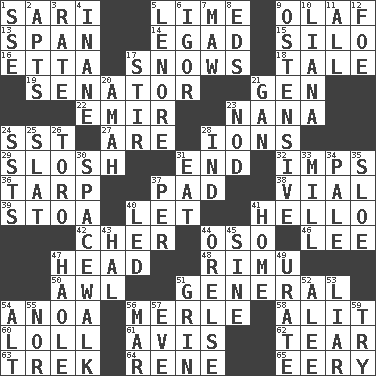ACROSS 1. Indian skirt 5. Welles in "The Third Man" 9. Norwegian king 13. Connect, as a bridge 14. Mild oath 15. Grain storage tower 16. Singer James 17. Overwhelms 18. Falsehood 19. Legislator 21. Commissioned mil. rank 22. Arab leader 23. Nanny 24. Fast jet (abbr.) 27. "We ___ not amused" (Victoria) 28. Charged particles 29. Splash clumsily 31. Conclusion 32. Naughty children 36. Canvas cover 37. Groovy apt. 38. Small bottle 39. Portico 40. Allow 41. Phone greeting 42. "Mermaids" star 44. Bear (Spanish) 46. Area sheltered from the wind 47. Froth on beer 48. Tall New Zealand timber tree 50. Leather borer 51. Commissioned military rank 54. Small Philippine buffalo 56. Haggard of country music 58. Set down 60. Hang loosely or laxly 61. Opinion 62. Lacerate 63. Long journey 64. French philosopher Descartes 65. Suggestive of the supernatural DOWN 1. Compass dir. 2. Tenement units (abbr.) 3. Pace 4. Lacking in sense or substance 5. Poe poem 6. Russian composer Stravinsky 7. Opening into something insatiable 8. Begley and Asner 9. Clearly or manifestly demonstrative 10. Woody, climbing, usually tropical plant 11. 100% 12. Enemy 17. Commotion 20. Wet nurse 21. Separate the seeds from cotton 23. Lower and raise head in agreement 24. Fast planes 25. Narrow board 26. "Corrida" creature 28. Working for oneself (abbr.) 30. High altitude stroll 31. Consume 33. Place where flour is made 34. Diluted with white 35. A type of plum 37. For each 40. Directed 41. Residence 43. Actor Linden 44. Threatening words 45. Trig term 47. White Person, in Hawaii 49. A salt of uric acid 51. Broad smile 52. Toward shelter 53. One who doesn't tell the truth 54. Keyboard modifier key 55. Not either 56. Make imperfect 57. First lady 59. Attempt