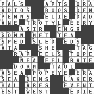 ACROSS 1. Friends 5. Flats, for short 9. Mouth or opening 12. Goodbye (Sp.) 14. Scornful sounds 15. Lair 16. Actor Sean's family 17. Writer Wiesel 18. Male parent 19. One (Scot) 20. Trinitrotoluene 23. Suggestive of the supernatural 24. SW Saudi Arabia district 25. Engineer (abbr.) 27. Woman's formal wear 30. Was introduced to 32. Afternoon social gathering 33. Drove too fast 34. Downhill vehicle 36. Begley and Asner 38. "One Day ___ Time" 39. A female animal or person 40. Label 43. Hit sharply and swiftly 46. Snakelike fish 48. Drink excessively 49. Teachers' org. 51. Snakelike fish 52. Assign a rank or rating to 53. Dormintory (informal) 54. "Change" in Tahitian 56. Toward the sea 58. Wimpy's pal 61. Period 64. Ocean 65. Hiding places for outlaws 66. Member of a famous L.A. basketball team 68. Actor Linden 69. Ancient Greek god of war 70. Happening 71. Eastern Standard Time (abbr.) 72. Compass direction 73. Singer Brickell DOWN 1. Dad 2. An important port of Yemen 3. Actor's bit 4. Boy, to dad 5. Collude with 6. Much (prefix) 7. Bathroom plumbing fixture 8. Compass dir. 9. More peculiar 10. Located in or toward the back 11. Actor Griffith 13. Fast planes 21. Basketball hoops 22. Threatening words 23. Mild oath 24. Also 26. Born 27. Girls' org. (abbr.) 28. Choose 29. Erode 31. Giggle 35. Keyboard key 37. Portico 41. Fitting 42. Turn to the right 44. Small Philippine buffalo 45. For each 47. Kill 48. Three (prefix) 50. Electrical Unit 53. Started a card game 55. Ubangi River tributary 56. American tennis player Robert 57. Oceans 59. Washington bills 60. Inconspicuous attention getter 61. Made supply last 62. Painter Guido (1575-1642) 63. Johnson of "Laugh-In" 65. Simpleton 67. "___ Maria"