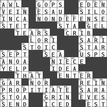 ACROSS 1. Leather borer 4. Republicans 8. Genesis locale 12. Distinctive style or manner 14. He sold his birthright 15. Grain storage tower 16. South American Indian 17. Unrelated to defense, as in spending 20. Proofreading order 21. R.R. building 22. Set 23. Lacerates 27. Baby bed with high sides 29. Australian parrot (variant) 31. Indian skirt 34. Unemotional 35. Play the lead 36. Back-to-school mo. 39. Ocean 41. United States Postal Service (abbr.) 42. Small Philippine buffalo 43. Sibling's daughter 46. Sharp bark 47. The content of cognition 48. Not this but _ 51. Keyboard key 54. Slender fish 56. Not either 58. It's straight from the horse's mouth 61. Conciliate 66. "Two Mules for Sister ____" 67. Portico 68. Amused look 69. Nights before holidays 70. Post 71. On the rocks 72. Eastern Standard Time (abbr.) DOWN 1. Deliberation 2. Gone 3. It is permitted: Lat. 4. Commissioned military rank (abbr.) 5. Bear (Spanish) 6. Baking dish 7. Beer foam 8. Compass dir. 9. Empty-headed or silly people 10. Otherwise 11. Christmas carol 13. Nathan's nickname 18. And so on (abbr.) 19. Distant 24. Keyboard modifier key 25. Friend of Pooh 26. Indian titles of respect 28. Come out of 30. Ancient Celtic tribe of eastern Britain 32. Strike 33. Big collection agency 34. Staphylococcus 36. Declare 37. Compass dir. 38. Coward 40. Assistant 44. Car or cant ending 45. Feline 49. Black tropical American cuckoo 50. Small child 52. Celtic language 53. Rob, plunder, or pillage 54. Global Positioning Systems (abbr.) 55. Johnson of "Laugh-In" 57. Swiss mountan, "Queen of the Mountains" 59. Angers 60. Political cartoonist Thomas 62. Groovy apt. 63. Curve 64. Standoff 65. Conclude