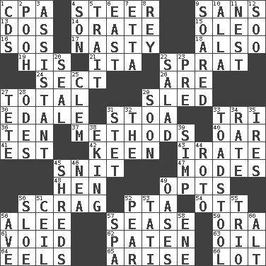 ACROSS 1. Numbers guy (abbr.) 4. Navigate 9. Without 13. Two (Sp.) 14. Declaim 15. Margarine 16. Mayday 17. Smutty 18. In addition 19. Part of HMS, perhaps 21. Call ___ day 22. Small fatty European fish 24. Religious group 26. "We ___ not amused" (Victoria) 27. Add up to 29. Downhill vehicle 30. Peak District village in England 31. Portico 33. Three (prefix) 36. Nine, plus one 37. Modes 40. Boat paddle 41. Eastern Standard Time (abbr.) 42. Peachy ____! 43. Feeling or showing extreme anger 45. In a ____ (agitated or irritated) 47. Methods 48. Layer 49. Elects 50. Strangle with an iron collar 52. Parent Teacher Association (abbr.) 54. Baseball player Mel 56. Toward shelter 57. Gospel singer Marvin 59. Mouth or opening 61. Lacking any legal or binding force 62. Eucharist need 63. Petroleum 64. Snakelike fish 65. Originate 66. Car dealer's back yard DOWN 1. Music discs 2. "Silly old bear" 3. Aide 4. Male child 5. Distinguishing feature 6. Compass direction 7. Singer James 8. Marina Del _, California 9. Flew 10. Silent film actress Nazimova 11. Egg locale 12. "Barney Miller" actor Jack 20. Lick closed 22. First course 23. Before (prefix) 25. Clement's nick name 27. Wig 28. Lyric poems 29. Within a short period 31. Proofreading order 32. Definite Article 33. Inedible or poisonous agaric 34. Assign a rank or rating to 35. Angers 38. Supplementing with great effort 39. Simple or foolish person 44. Printing process, for short 45. Fragments 46. Teachers' org. 49. Fertile tracts in a desert 50. A type of plum 51. To provide with a ceiling 52. Lightbulb-shaped fruit 53. Jacques of French films 55. Musical group of three 56. "___ Maria" 57. Health resort 58. Compass dir. 60. The first octave above the treble staff