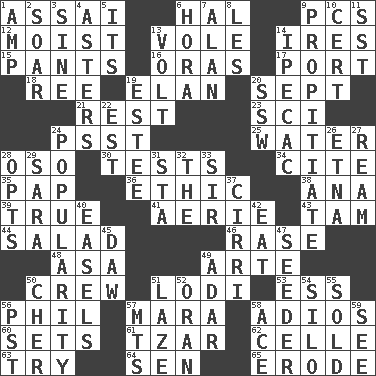 ACROSS 1. Slender Brazilian palm 6. Actor Linden 9. Personal Computers (abbr.) 12. Damp 13. Short-tailed, large-bodied rat 14. Angers 15. Leg coverings 16. Mouths or openings 17. Sweet dark-red dessert wine 18. Portuguese money of account (variant) 19. Enthusiasm 20. Back-to-school mo. 21. Take ten 23. _-fi 24. Inconspicuous attention getter 25. Wetness 28. Bear (Spanish) 30. Trials 34. Quote 35. Infant food 36. Principle of right and wrong 38. Santa ___, CA 39. Loyal 41. Nest on high 43. Scottish cap 44. Vegetable dish 46. To erase 48. White ___ sheet 49. Johnson of "Laugh-In" 50. Ship's personnel 51. Farming town in central California 53. Curvy letter 56. Silvers or Donahue 57. Hindu Mythology: god of death 58. Goodbye (Sp.) 60. Puts into a specified state 61. Czar 62. Cell (Danish) 63. Attempt to accomplish something 64. Elected rep. 65. Eat (away) DOWN 1. Electrical Unit 2. Fly high 3. Trig term 4. Michaelmas daisies 5. ___ a Wonderful Life 6. Israeli folk dance 7. ____ Jay Lerner 8. French article 9. Appease 10. Certainty 11. Fast jet (abbr.) 13. Electrical Unit 14. Medicinal drug used to evoke vomiting 19. First name in cosmetics 20. Compass dir. 22. Eastern Standard Time (abbr.) 24. Teen's desire 26. Inactive volcano in Sicily 27. 480, 500 or 516 sheets of paper 28. Chooses 29. "Two Mules for Sister ____" 31. R.R. building 32. Definite Article 33. Title for a knight 37. High-altitude cloud 40. Artist's stands 42. Erode 45. Obsolete 47. Sowing specialist 49. The sixth month of the Jewish calendar 50. "Mermaids" star 51. Goldbrick 52. Northwest Algerian city 54. Grain storage tower 55. Disposed of to a purchaser 56. Pacific Standard Time (abbr.) 57. Mountains (abbr.) 58. Adept person 59. Observe