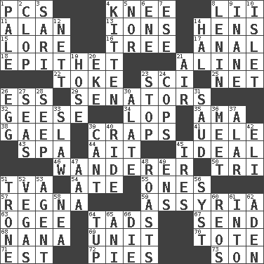 ACROSS 1. Personal Computers (abbr.) 4. Leg joint 8. Cards in a Roman deck? 11. Actor Alda or Thicke 13. Charged atoms 14. Coop moms 15. Old wives' tales, e.g. 16. Relationship diagram 17. Of or related to the anus 18. Curse 21. Place in a line 22. Puff or smoke 23. _-fi 25. Fish or hair follower 26. Double-curved letter 29. Elected representatives 32. Honkers 34. Trim (branches) 35. Nursemaid (var.) 38. Highlander 39. Dice game 41. Ubangi River tributary 43. Health resort 44. Small island 45. Perfect 46. Roamer 50. Three (prefix) 51. Federal power corp. 54. Had dinner 55. Singles 57. Canadian anthropologist Darnell 59. Nineveh was its capital 63. Double curve, resembling the letter S 64. Small boys 67. Post 68. Nanny 69. A single undivided whole 70. Haul 71. Eastern Standard Time (abbr.) 72. Sliced desserts 73. Male child DOWN 1. Diluted with white 2. Hoof sound 3. Indian skirt 4. Baby cat 5. Not either 6. Compass dir. 7. Compass dir. 8. Soviet premier 1918-24 9. Lacking in sense or substance 10. Small island 12. Remaining after all deductions 14. Actor Linden 19. Stockings 20. Make supply last 21. Wind 23. Obstruct or block passage 24. 911 reaches them 26. Oval reproductive body of a fowl 27. Oceans 28. Ooze 30. Having winglike extensions 31. Saudi Arabian king (1953-1964) 33. Cole _ (cabbage dish) 36. Confront 37. Having or resembling wings 39. Patter 40. Travel on an animal 42. Connecticut Ivy Leaguer 45. Angers 47. American Automobile Association (abbr.) 48. Exposes to great heat 49. Followers of ems 51. Marketplace scale 52. Viva Las _ 53. Representative 56. System (abbr.) 58. Teachers' org. 60. Vintage cars 61. To the inside or interior of 62. Arabian gulf 64. Uncastrated adult male sheep 65. Black tropical American cuckoo 66. Pass on