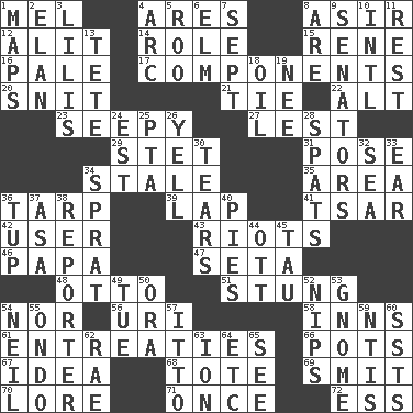 ACROSS 1. Cartoonist voice _ Blanc 4. Ancient Greek god of war 8. SW Saudi Arabia district 12. Set down 14. Hero or heavy, e.g. 15. French philosopher Descartes 16. Diluted with white 17. Parts 20. In a ____ (agitated or irritated) 21. Standoff 22. Keyboard modifier key 23. Not well drained, as in land 27. For fear that 29. Proofreading order 31. Airs 34. Lacking originality or spontaneity 35. Length times width 36. Canvas cover 39. Infant locale 41. Russian ruler of old 42. One who uses or employs something 43. Debaucheries 46. Dad 47. Stalk of a moss capsule 48. "Beetle Bailey" pooch 51. Feeling sharp psychological pain 54. Or not 56. RI univ. 58. Lodging establishments 61. Pleas 66. Plant holders 67. The content of cognition 68. Carry 69. Stricken, poetically 70. Old wives' tales, e.g. 71. Single time 72. Curvy letter DOWN 1. Atlas contents 2. Flair 3. Ms. Damita and namesakes 4. Curve 5. Friend of Pooh 6. Shade tree 7. Back-to-school mo. 8. "We ___ not amused" (Victoria) 9. Legislators 10. International (abbr.) 11. State of inaction 13. Wig 18. Petroleum 19. Born 24. Eastern Standard Time (abbr.) 25. Parent Teacher Assoc. 26. Shout 28. Arguments over trivial matters 30. Pulls apart 32. Ocean 33. Hearing organ 34. Small fatty European fish 36. Uncastrated adult male sheep 37. White ___ sheet 38. Newsperson 40. Sliced desserts 44. Baseball player Mel 45. The 19th letter of the Greek alphabet 49. Third day of the wk. 50. Mouth or opening 52. Cuts off 53. Dwarf 54. Famous astronaut Armstrong 55. Southwest Nigerian state 57. "Tell ____ the Marines!" 59. Nuclear Threat Initiatives 60. Fast planes 62. Actress Charlotte 63. Electrically charged atom 64. And so on (abbr.) 65. Observe