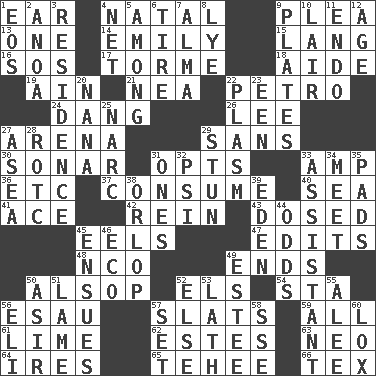 ACROSS 1. Ewer handle 4. Relating to or accompanying birth 9. Entreaty 13. Single 14. Poet Dickinson 15. Austrian-born American filmmaker Fritz 16. Mayday 17. Singer Mel 18. Assistant 19. The 18th letter of the Arabic alphabet 21. Teachers' org. 22. Stone: prefix 24. Mild oath, euphamism for damn 26. Area sheltered from the wind 27. Sports stadium 29. Without 30. Underwater navigation system 31. Chooses 33. Electrical Unit 36. And so on (abbr.) 37. Ingest 40. Ocean 41. Adept person 42. It's straight from the horse's mouth 43. Administered medicine 45. Snakelike fish 47. Proofreads 48. Non-commissioned officer (abbr.) 49. Extremities 50. Columnist Joseph or Stewart 52. Raised railways 54. R.R. building 56. He sold his birthright 57. Narrow boards 59. 100% 61. Welles in "The Third Man" 62. _____ Park, CO 63. Modern: prefix 64. Angers 65. Giggle 66. John Ritter's dad DOWN 1. Greek goddess of the dawn 2. Small Philippine buffalo 3. Home 4. Fish or hair follower 5. Amid 6. Become fatigued 7. _ mater 8. Sodium hydroxide 9. Food holders 10. Den 11. Inside; within (prefix) 12. Grow older 20. Grandmother 22. Suffix with ecto or cyto 23. Car or cant ending 25. Drug cop 27. Toward the sea 28. College mil. group 29. Astound 31. Washington bills 32. 23rd letter of the Greek alphabet 33. Helper 34. Confront 35. Writing tablets 38. Lowest deck of a ship 39. Locale of original sin 44. Probability 45. Takes place subsequently 46. Environmental prefix 49. First name in cosmetics 50. SW Saudi Arabia district 51. Unable to walk 52. Otherwise 53. Thin strip of wood or metal 55. Toward shelter 56. Connecticut Ivy Leaguer 57. Put into a specified state 58. Compass dir. 60. Brine-cured salmon