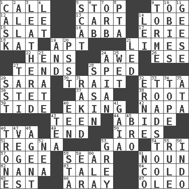 ACROSS 1. Give a ring to 5. Cease 9. Coat; cloak 12. Toward shelter 13. Draw slowly or heavily 14. Ear part 15. Narrow board 16. Swedish rock group 17. 4th largest of the Great Lakes 18. Krazy ___ of comics 19. Fitting 21. Citrus fruits 22. Coop moms 24. Deep reverence 26. Compass dir. 27. Is inclined (to) 28. Broke a traffic law 29. "Two Mules for Sister ____" 30. Distinguishing feature 32. Singer James 36. Proofreading order 37. White ___ sheet 38. Carrot, for example 39. Event that recurs at intervals 40. Supplementing with great effort 42. California wine valley 43. Adolescent 44. Tolerate 46. Federal power corp. 49. Conclude 50. Angers 51. Canadian anthropologist Darnell 53. E Mali city 54. Three (prefix) 57. Double curve, resembling the letter S 58. Dry up 61. Part of speech 62. Grandmother 63. Falsehood 64. Chilled 65. Eastern Standard Time (abbr.) 66. Like ___ of sunshine 67. Margarine DOWN 1. Keg 2. Silent film actress Nazimova 3. Resembling or made to resemble leather 4. Allow 5. Go away! 6. Keyboard key 7. Globe 8. Parent Teacher Association (abbr.) 9. Singer Mel 10. Off-Broadway awards 11. Honkers 14. Luau accessory 19. Also 20. Inconspicuous attention getter 21. Directed 23. Related on the mother's side 24. Bee-related 25. Soggy 27. Jacques of French films 28. Indian antelope 29. Fast jet (abbr.) 31. Moved through 32. Bert's buddy 33. Inedible or poisonous agaric 34. Drink excessively 35. _ moment's notice (2 wds.) 40. Car or cant ending 41. Greek goddess of the earth (variant) 43. Beverage made from leaves 45. Sis' sibling 46. Marketplace scale 47. Viva Las _ 48. Rep 52. Teachers' org. 53. Jennifer or Joel 55. Court order 56. _ china 58. R.R. building 59. Ewer handle 60. Chicken ___ king 61. Non-commissioned officer (abbr.)