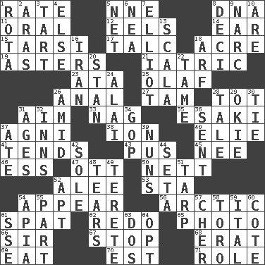 ACROSS 1. Assign a rank or rating to 5. Compass dir. 8. Heredity factor (abbr.) 11. Spoken 12. Snakelike fish 14. Hearing organ 15. Tarsus (plural) 17. Baby powder 18. Measure of real estate 19. Michaelmas daisies 21. Of or pertaining to medicine 23. _ moment's notice (2 wds.) 25. Norwegian king 26. Of or related to the anus 27. Scottish cap 28. Small child 31. Direct toward a target or goal 33. Tired old horse 35. 1973 Nobel Price Winner (Physics) Leo 37. Hindu god of fire 38. Electrically charged atom 40. Writer Wiesel 41. Is inclined (to) 43. Tenth month of the Hindu calendar 45. Born 46. Double-curved letter 47. Baseball player Mel 50. Remaining after all deductions 52. Toward shelter 53. R.R. building 54. Become visible 56. Northern region 61. Petty quarrel 62. Redecorate 65. Picture 66. Title for a knight 67. Constrict 68. Part of Q.E.F. 69. Erode 70. Eastern Standard Time (abbr.) 71. Hero or heavy, e.g. DOWN 1. Roll call or roster of names 2. Ancient river in northeast Turkey 3. Small pie 4. Otherwise 5. Fish or hair follower 6. Teachers' org. 7. American author Paul (1891-1958) 8. Tenth: prefix 9. Drug cop 10. "We ___ not amused" (Victoria) 13. Any of the three canals of the cochlea 16. SW Asia republic 18. Sandy's bark 20. Comedian Laurel of Laurel & Hardy 22. Not wild 24. Mountain range southwest of Kyrgyzstan 26. Among 28. Falsehood 29. Migrant worker of the '30s 30. Make a knot 31. Eons 32. Restaurants 34. Republican Party 36. Posted 37. Had dinner 39. Religious women 42. Flatfish 44. Bristle 48. Lacerates 49. Cylindrical with tapered ends 51. Canvas cover 52. Fitting 54. Capital of Western Samoa 55. Component 57. "Mermaids" star 58. "Corrida" creature 59. Slanted text style (abbr.) 60. ____ d'Azur (French Riviera) 61. Compass dir. 63. Two (Sp.) 64. Choose