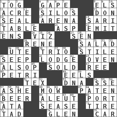 ACROSS 1. Coat; cloak 4. Open wide 8. Raised railways 11. Measure of real estate 13. Grain storage towers 15. Spanish title 16. Lick closed 17. Sports stadium 18. Indian skirt 19. Eating place 21. Viper 22. Give off 23. Followers of ems 24. To wit 27. Elected rep. 29. French philosopher Descartes 30. Vegetable dish 34. Shoshoni 36. Musical group of three 39. Vertical member of a panel or frame 40. Ooze 41. Inn 43. Baking chamber 44. Columnist Joseph or Stewart 46. Disposed of to a purchaser 47. To riddle 48. _ dish (used to culture cells) 49. Snakelike fish 51. John Ritter's dad 53. Heredity factor (abbr.) 54. Compass dir. 57. American tennis player Robert 60. Cut the grass 63. Eucharist need 65. Fermented drink made from hops 66. Eskimo relative 69. Sweet dark-red dessert wine 70. "One Day ___ Time" 71. Gospel singer Marvin 72. Hoop that covers a wheel 73. Small amount or degree 74. Small, secluded valley 75. Automobile DOWN 1. Clothes sense 2. Sea 3. Seizes 4. Girls' org. (abbr.) 5. Wind 6. Entreaty 7. Immeasurably long periods of time 8. Dutch treat 9. Australian parrot (variant) 10. In a ____ (agitated or irritated) 12. Pipe bend 14. Plant excrements 18. Elected representatives 20. First lady 25. International (abbr.) 26. Nothings 28. Curvy letter 29. News announcer 31. Not recorded 32. Toward shelter 33. Lair 34. Ubangi River tributary 35. Trial 37. Wedding promise 38. Stared 40. Plant excrement 42. Paradise 45. Sliced dessert 50. Pet locale 52. Dec. holiday 54. Unemotional 55. Father Junipero _ 56. Keyboard key 57. Blind as ____ 58. Stalk of a moss capsule 59. Froth on beer 61. Cassini of fashion 62. Welt 64. Fitting 67. Purpose 68. Nine, plus one