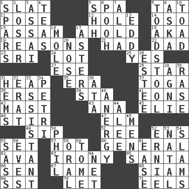 ACROSS 1. Narrow board 5. Health resort 8. Make lace 11. Airs 12. Hollow 14. Bear (Spanish) 15. Indian state 17. Hold, grip (Informal) 18. Alias (abbr.) 19. Thinks logically 21. Possessed 22. June honoree 23. _ Lanka 24. Car dealer's back yard 25. Consenting reply 27. Compass dir. 28. Play the lead 31. Pile 35. Period 37. Ancient Roman robe 38. Celtic language 39. R.R. building 41. Immeasurably long periods of time 42. Vertical spar for supporting sails 43. Santa ___, CA 45. Writer Wiesel 46. Commotion 47. Shade tree 49. Small drink 51. To sift 52. Followers of ems 55. Put into a specified state 57. Being at a high temperature 60. Commissioned military rank 62. Actress Gardner 63. Literary sarcasm 65. Before Barbara or Clara 66. Elected rep. 67. Unable to walk 68. Thailand, formerly 69. Fast jet (abbr.) 70. Allow 71. Snakelike fish DOWN 1. Practice fights 2. Failure 3. Slender Brazilian palm 4. Beverages made from leaves 5. Quiet! 6. "Silly old bear" 7. Silent film actress Nazimova 8. Inedible or poisonous agaric 9. "____ silly question..." 10. Frog relative 13. Whirlpool 16. Undercover agent 17. Michaelmas daisies 20. Olfactory organ 26. First name in cosmetics 29. Hindu god of fire 30. To erase 31. Is hesitant and indecisive 32. Part of Q.E.F. 33. Aide 34. _ dish (used to culture cells) 36. _ moment's notice (2 wds.) 40. Disorder of the immune system 44. Toward shelter 48. Not women's 50. Silvers or Donahue 52. Bert's buddy 53. Relating to or accompanying birth 54. Shuts with force 55. Backtalk 56. Nights before holidays 58. Spoken 59. Heavy book 61. Comfort 64. Fish or hair follower