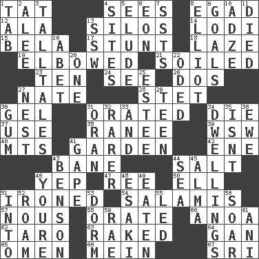 ACROSS 1. Make lace 4. Perceives with the eye 8. Mild oath 12. According to 13. Grain storage towers 14. Farming town in central California 15. Actor Lugosi 17. Difficult or unusual or dangerous feat 18. Goldbrick 19. Shoved, as through a crowd 21. Dirtied 23. Nine, plus one 24. Observe 26. Two (Sp.) 27. Nathan's nickname 28. Proofreading order 30. Set 31. Spoke pompously 34. Pass on 37. Purpose 38. The wife of a rajah (variant) 39. Compass dir. 40. Mountains (abbr.) 41. Place where plants grow 42. Compass dir. 43. Object of repulsion 44. Table seasoning 46. Slangy assent 47. To riddle 50. Pipe bend 51. Pressed 54. Deli grouping 57. Horse sense 58. Declaim 60. Small Philippine buffalo 62. Edible starchy tuberous root 63. Swept the length of 64. Separate the seeds from cotton 65. Sign of things to come 66. Chow _ 67. Indian title of respect (Mr.) DOWN 1. Keyboard key 2. Toward shelter 3. Baron Munchausen's specialties 4. Locates 5. Evade 6. Age 7. Fast planes 8. American author Paul (1891-1958) 9. Finish lines 10. Edge tool used to cut and shape wood 11. Passed on 13. Compass dir. 16. Collude with 20. Single 22. Wrote a lyric poem 25. First name in cosmetics 27. A home for chicks 29. Adolescent 30. Chewing product 31. NW Algerian seaport 32. More valued for its uncommonness 33. Added to 34. Residences 35. Is not 36. She-sheep 41. Open wide 43. Gillaume's butler role 44. Ocean 45. _ mater 46. You are 48. 1973 Nobel Price Winner (Physics) Leo 49. Eroded 51. To the inside or interior of 52. Wander 53. Dormintory (informal) 55. Directed 56. Fly high 59. Actress Charlotte 61. Cuckoo