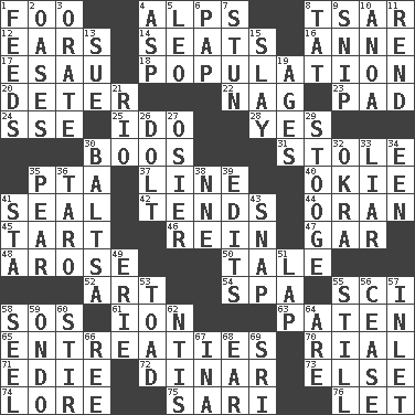 ACROSS 1. Egg _ yung 4. High mountains 8. Russian ruler of old 12. Hearing organs 14. Theater features 16. Queen of England 1702-14 17. Son of Isaac 18. Census information 20. Prevent from occurring 22. Tired old horse 23. Groovy apt. 24. Compass dir. 25. Wedding promise 28. Affirmative reply 30. Scornful sounds 31. Took without asking 35. Parent Teacher Assoc. 37. Actor's bit 40. Migrant worker of the '30s 41. Lick closed 42. Watches over 44. Northwest Algerian city 45. Small pie 46. It's straight from the horse's mouth 47. Slender fish 48. Came up 50. Falsehood 52. Nonscientific branch of learning 54. Health resort 55. _-fi 58. Mayday 61. Electrically charged atom 63. Eucharist need 65. Pleas 70. Monetary unit of Yemen 71. Singer Brickell 72. Middle Eastern gold or silver currency 73. Otherwise 74. Old wives' tales, e.g. 75. Indian skirt 76. Allow DOWN 1. Gives food to 2. Fertile tracts in a desert 3. Speak pompously 4. Cleo's killer 5. Lion 6. Infant food 7. Surprise greatly 8. Make lace 9. Sever or remove by pinching or nipping 10. Small Philippine buffalo 11. Tear apart 13. Take to court 15. Kill 19. Eons 21. River (Sp.) 26. Stupid person 27. Flexible twig of a willow tree 29. Moe Howard, for one 30. Greek mezzo-soprano Agnes 32. Gumbo ingredient 33. One who doesn't tell the truth 34. Car or cant ending 35. Lightbulb-shaped fruit 36. Edible starchy tuberous root 38. Compass dir. 39. Proofreads 41. R.R. building 43. Fastener 49. 4th largest of the Great Lakes 51. Pet locale 53. Frog relative 55. Free of sound 56. Stop 57. An arm off of a larger body of water 58. Stitch closed the eyes of (a falcon) 59. Southwest Nigerian state 60. Move through with a circular motion 62. Nuclear Threat Initiatives 64. "We ___ not amused" (Victoria) 66. To separate or throw off 67. _ tizzy (2 wds.) 68. Hearing organ 69. _ Lanka