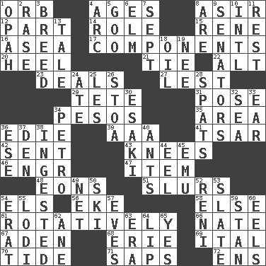 ACROSS 1. Globe 4. Grows older 8. SW Saudi Arabia district 12. Component 14. Hero or heavy, e.g. 15. French philosopher Descartes 16. Toward the sea 17. Parts 20. Person who is morally reprehensible 21. Neckwear 22. Keyboard modifier key 23. Allots cards 27. For fear that 29. False hair 31. Airs 34. Mexican monetary units 35. Length times width 36. Singer Brickell 39. American Automobile Association (abbr.) 41. Russian ruler of old 42. Transmitted 43. Leg joints 46. Engineer (abbr.) 47. A distinct part 48. Immeasurably long periods of time 51. Plays smoothly or legato 54. Raised railways 56. Make supply last 58. Otherwise 61. Producing rotation 66. Nathan's nickname 67. An important port of Yemen 68. One of the Great Lakes 69. Slanted text style (abbr.) 70. Periodic rise and fall of the sea level 71. Plant excrements 72. Followers of ems DOWN 1. Brightly colored fish 2. To erase 3. A special lineage 4. Curve 5. Thick or sticky substance 6. Shade tree 7. Back-to-school mo. 8. "We ___ not amused" (Victoria) 9. Elected representatives 10. International (abbr.) 11. Relief 13. Lie 18. Petroleum 19. Born 24. Had dinner 25. French article 26. Portico 28. Arguments over trivial matters 30. 1973 Nobel Price Winner (Physics) Leo 32. Ocean 33. Hearing organ 34. Stone: prefix 36. Compass dir. 37. Lair 38. Eaten 40. Pismires 44. Snakelike fish 45. Australian flightless bird 49. Fish or hair follower 50. What Jean-Claude Killy likes to do 52. Painter Guido (1575-1642) 53. Chalkboard 54. Part of Q.E.F. 55. Farming town in central California 57. Nights before holidays 59. Comedian Laurel of Laurel & Hardy 60. Snakelike fish 62. A saturated hydrocarbon 63. Period 64. Mouth edge 65. Consenting reply
